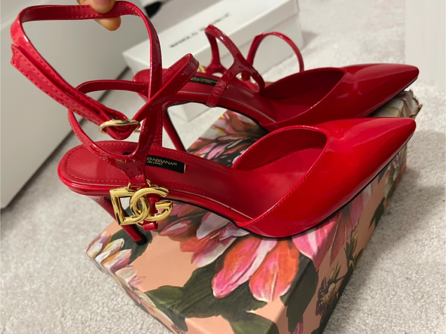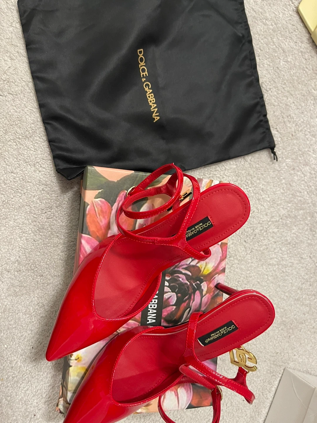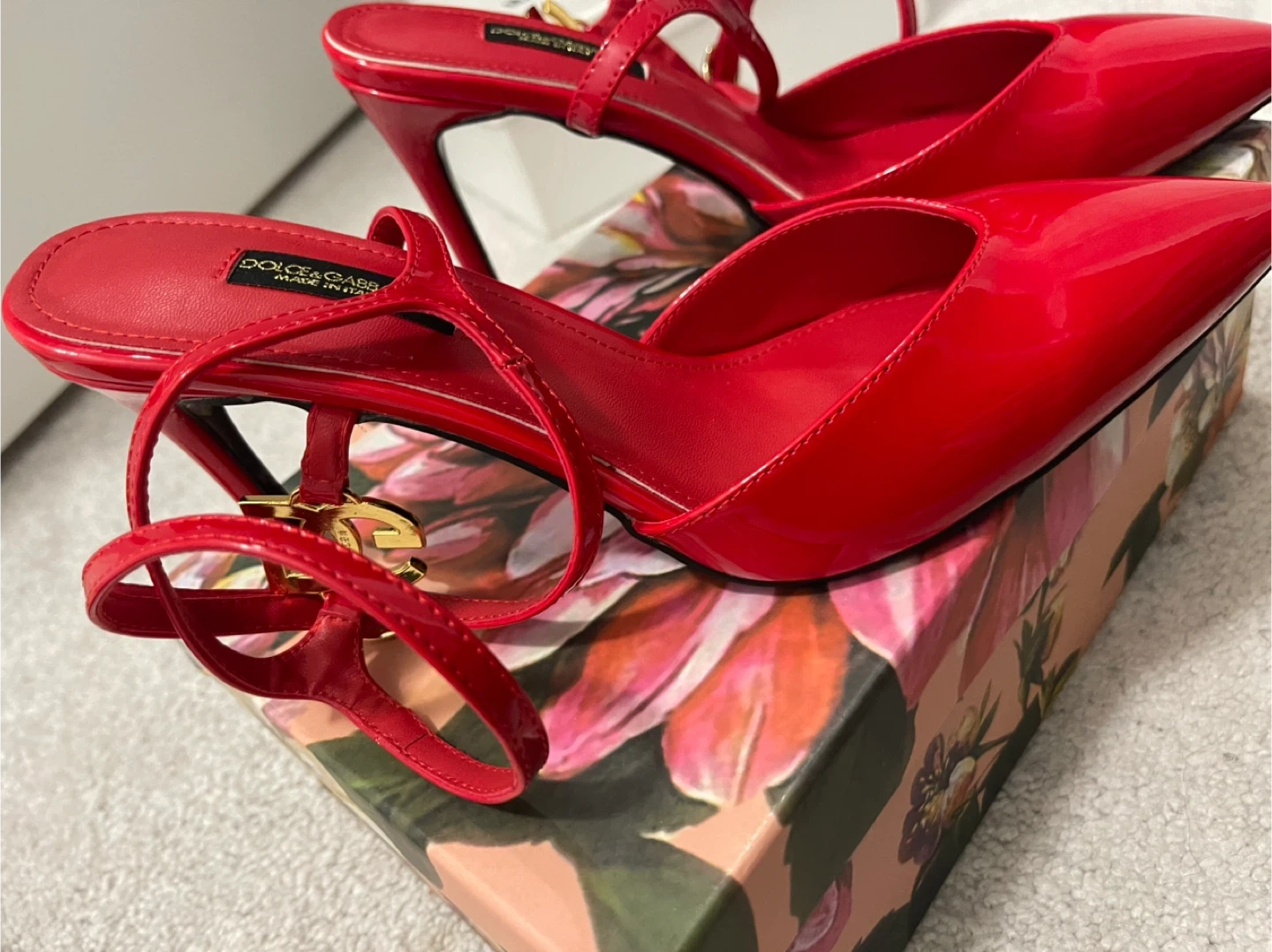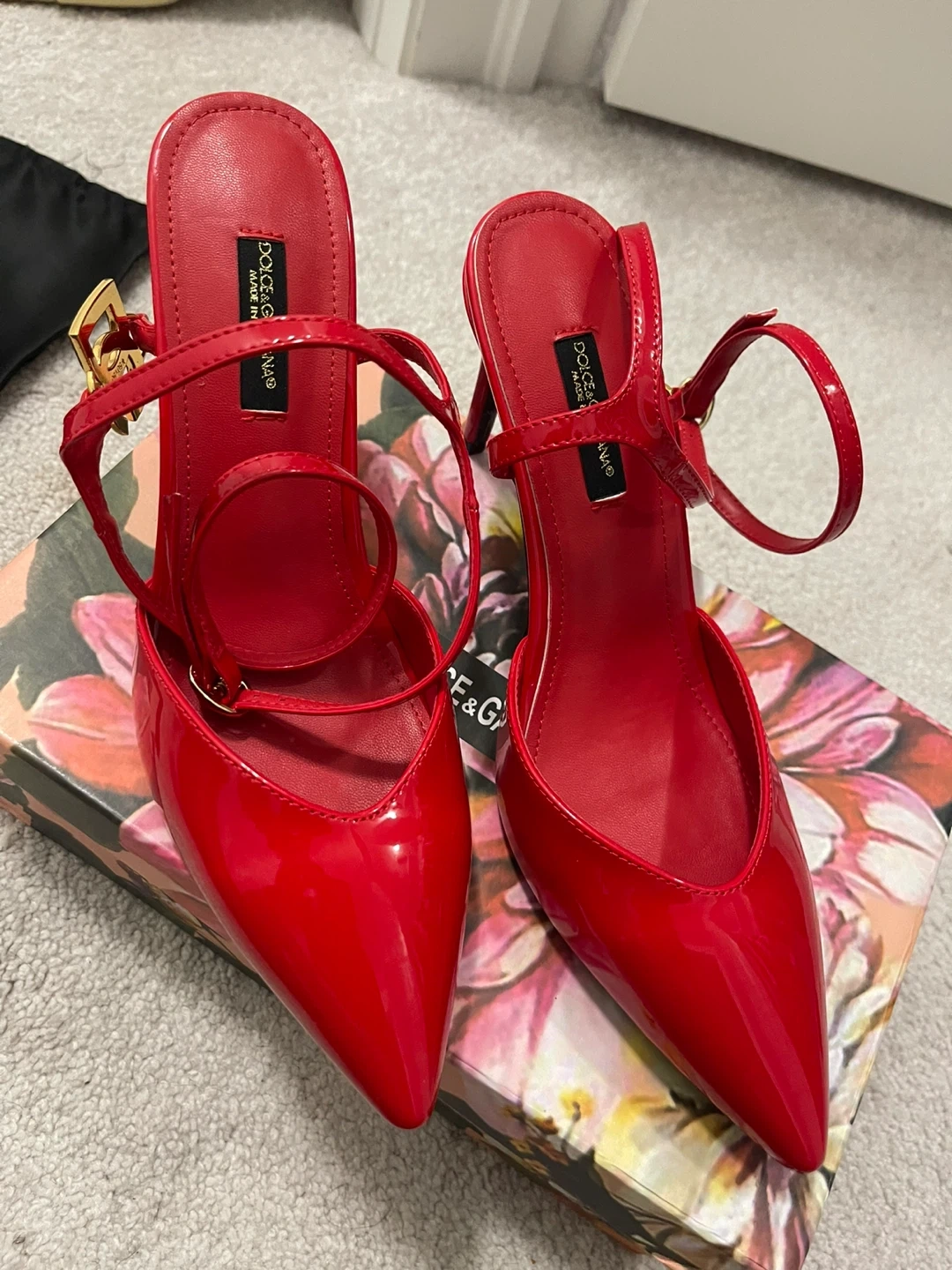 These Dolce & Gabbana heels are a vibrant red patent leather! They feature an ankle strap and a pointed toe. Comes with the original box and dust bag