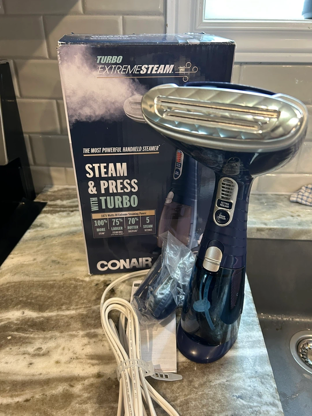 Conair Turbo Extreme Steam handheld steamer with original box. It's 1875 watts and has multiple steam settings. This steamer is for removing wrinkles from clothes. Used only once still in great condition. If it’s listed it’s available.