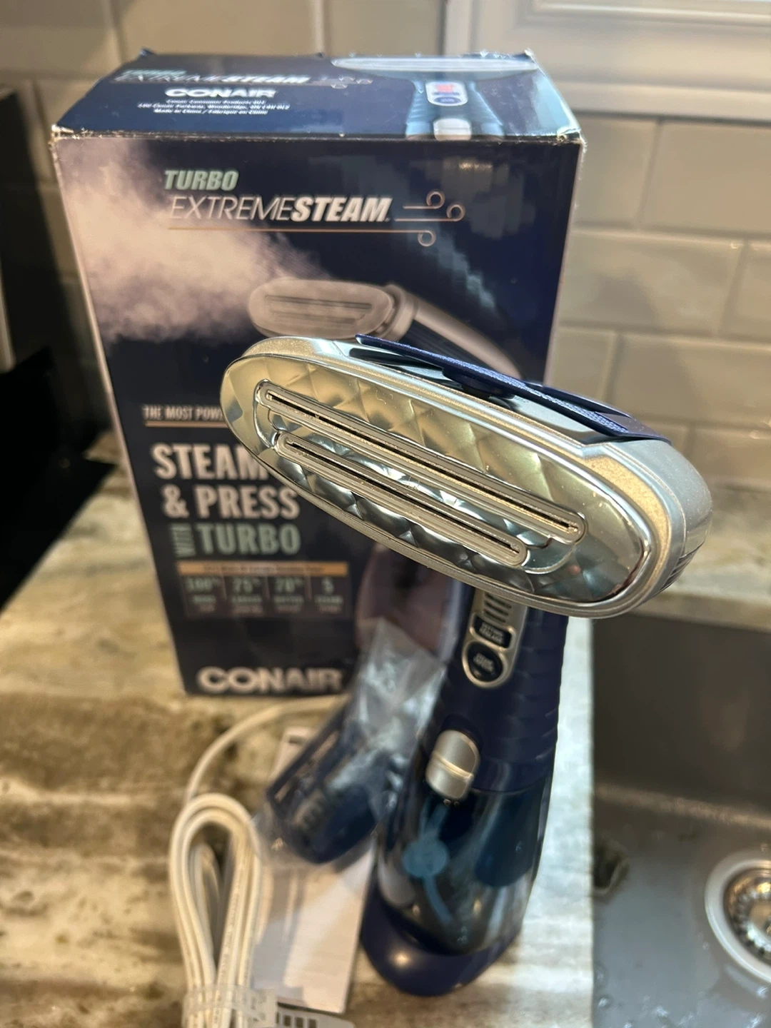 Conair Turbo Extreme Steam handheld steamer with original box. It's 1875 watts and has multiple steam settings. This steamer is for removing wrinkles from clothes. Used only once still in great condition. If it’s listed it’s available.