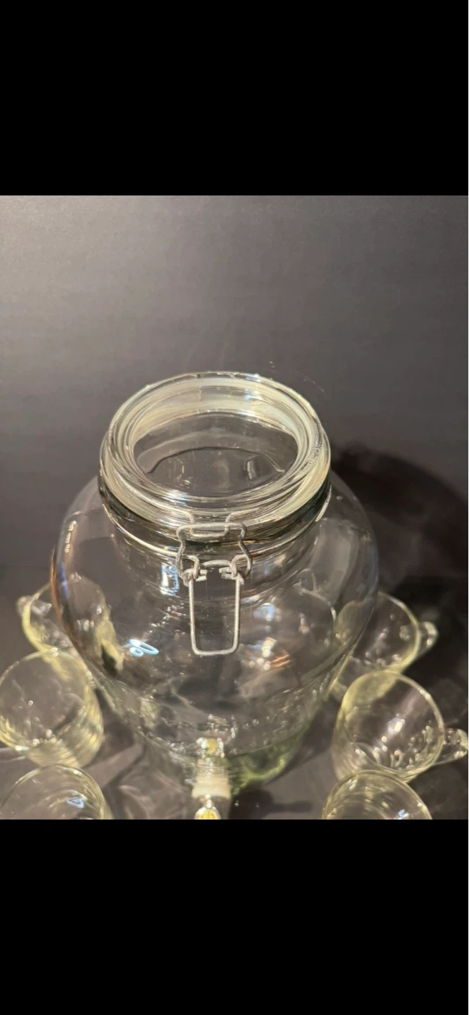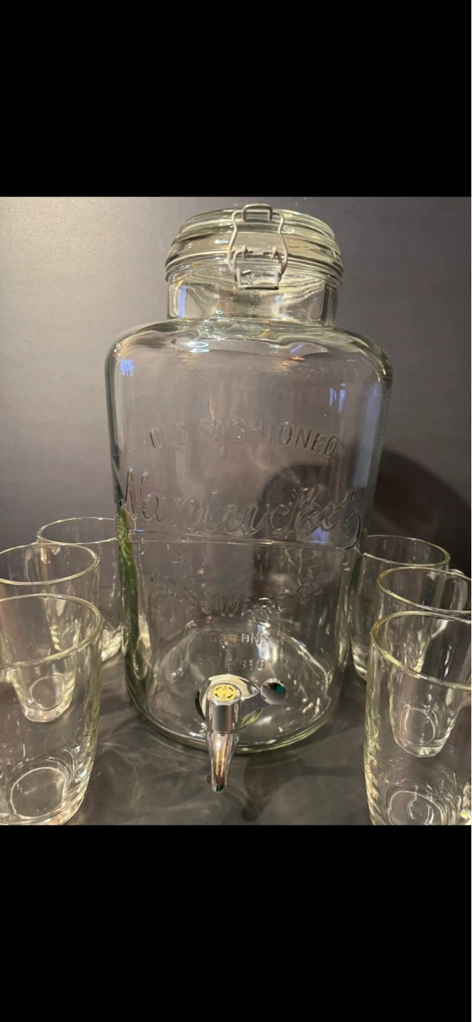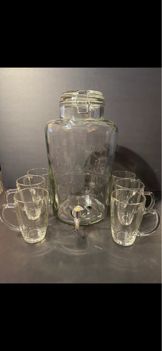 This is a clear glass beverage dispenser. It comes with six matching glass cups. Perfect for parties or gatherings! 7.5 liters, High 36 cm,Wide 20cm