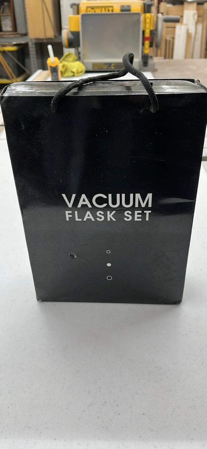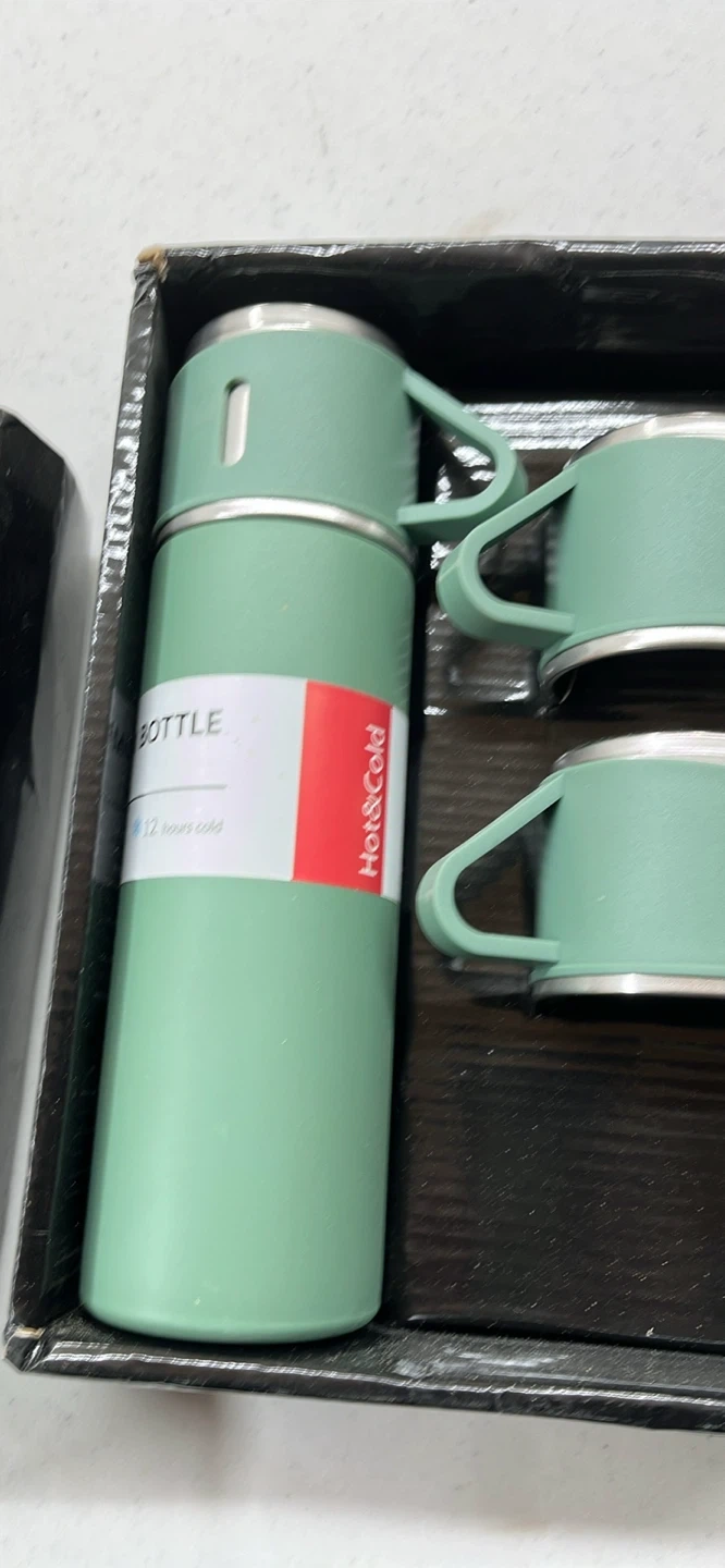 This is a green vacuum flask set with two mugs. The flask holds 500ml and keeps drinks hot or cold for 12 hours. It's made of stainless steel.