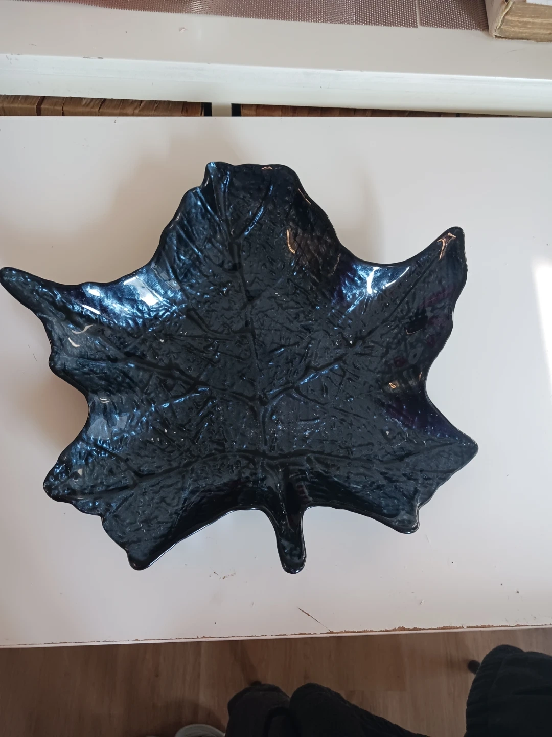A dark, glossy serving dish shaped like a maple leaf. It's made of ceramic and features a textured surface to mimic a real leaf. This dish is perfect for serving snacks or as a decorative piece.