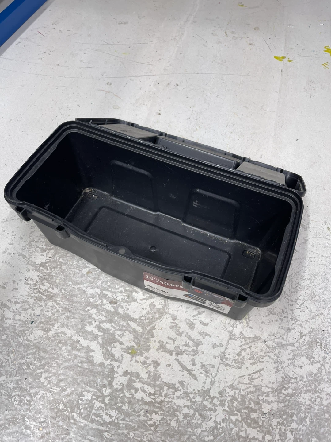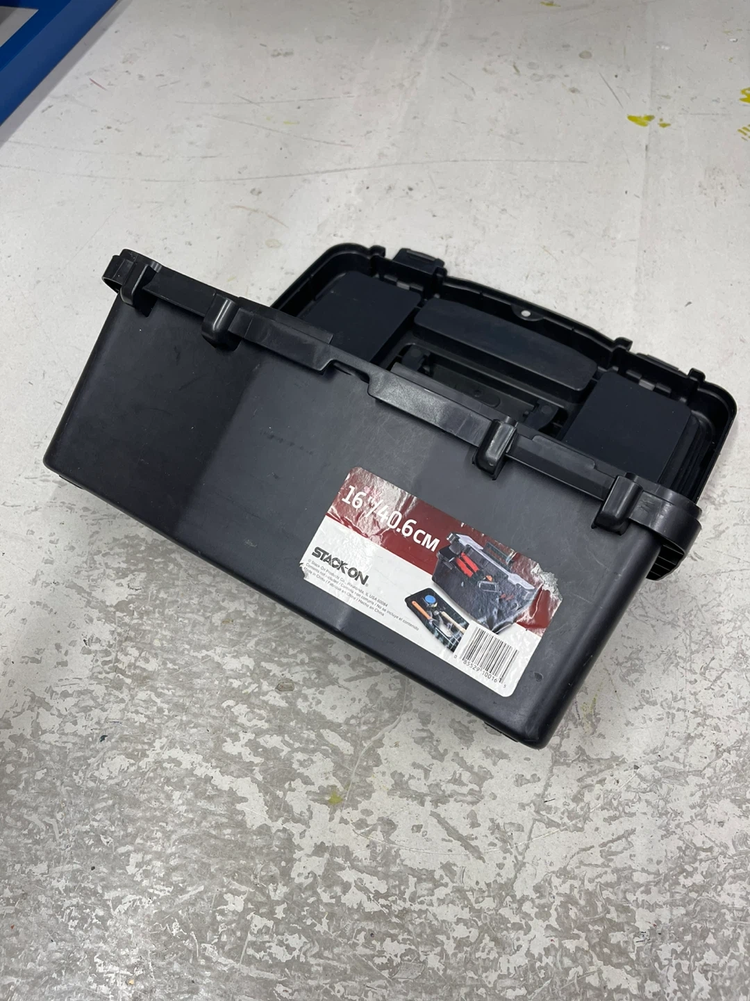 This black Stack-On 16-inch tool box is made of durable plastic. It features a removable tray for organization. This box is great for storing tools or craft supplies!