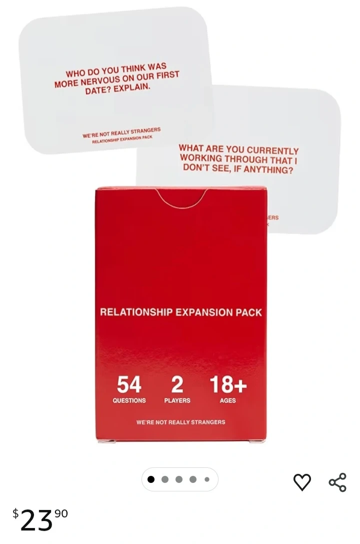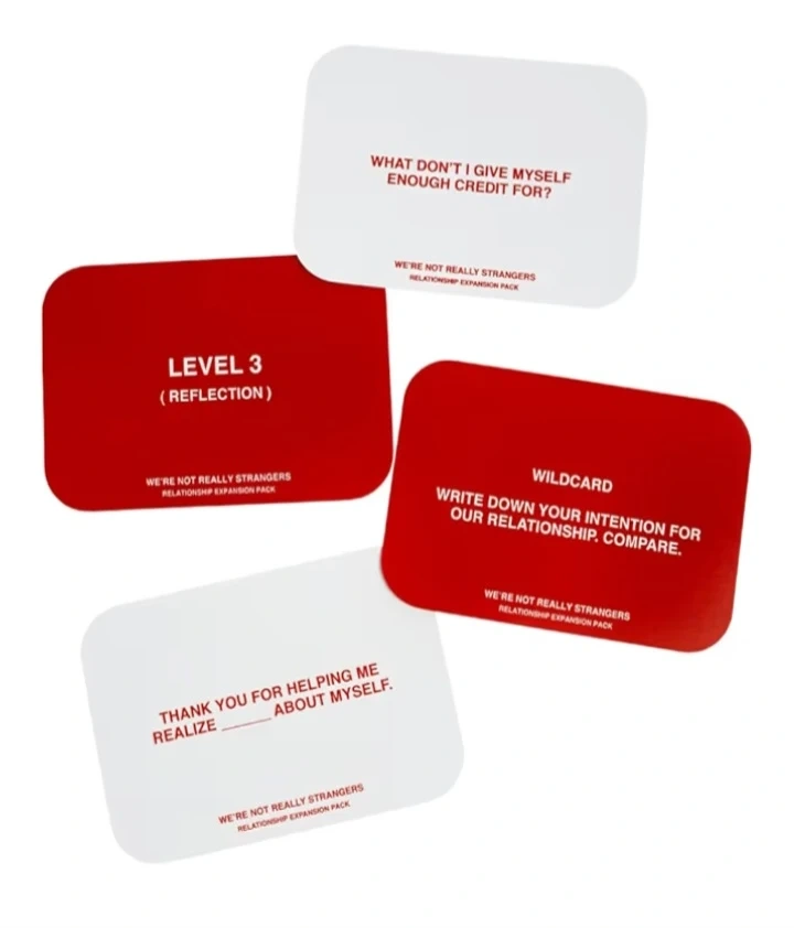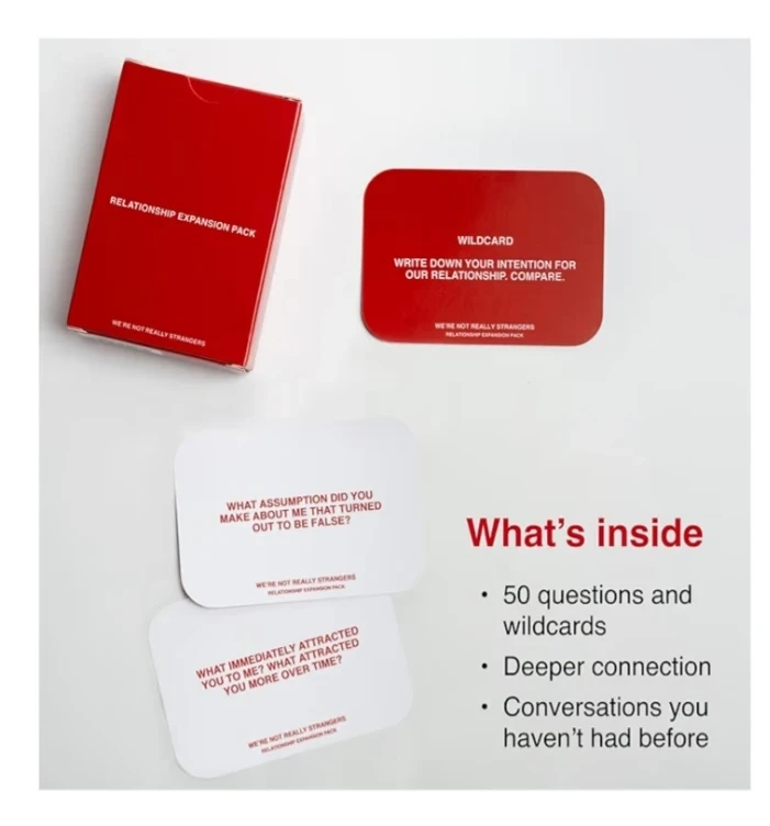 This is the Relationship Expansion Pack for We're Not Really Strangers. It includes 50 questions and wildcards. It's designed to help foster deeper connection and conversations.