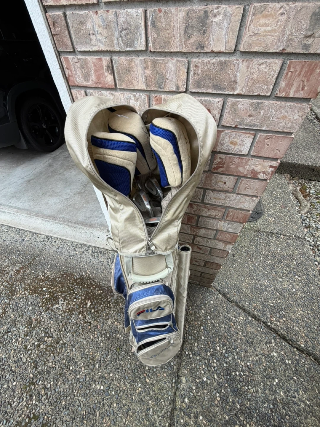 This is a beige and blue FILA clubs & golf bag. It has a full-length zipper top cover and multiple pockets for storage. The bag also features the 'Le Tour' designation.