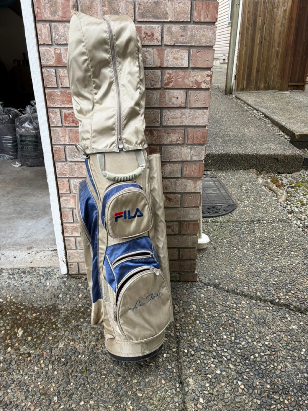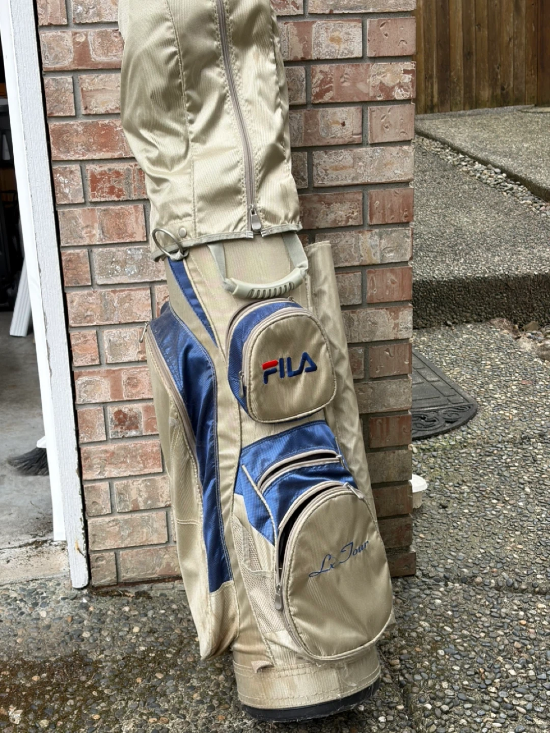 This is a beige and blue FILA clubs & golf bag. It has a full-length zipper top cover and multiple pockets for storage. The bag also features the 'Le Tour' designation.