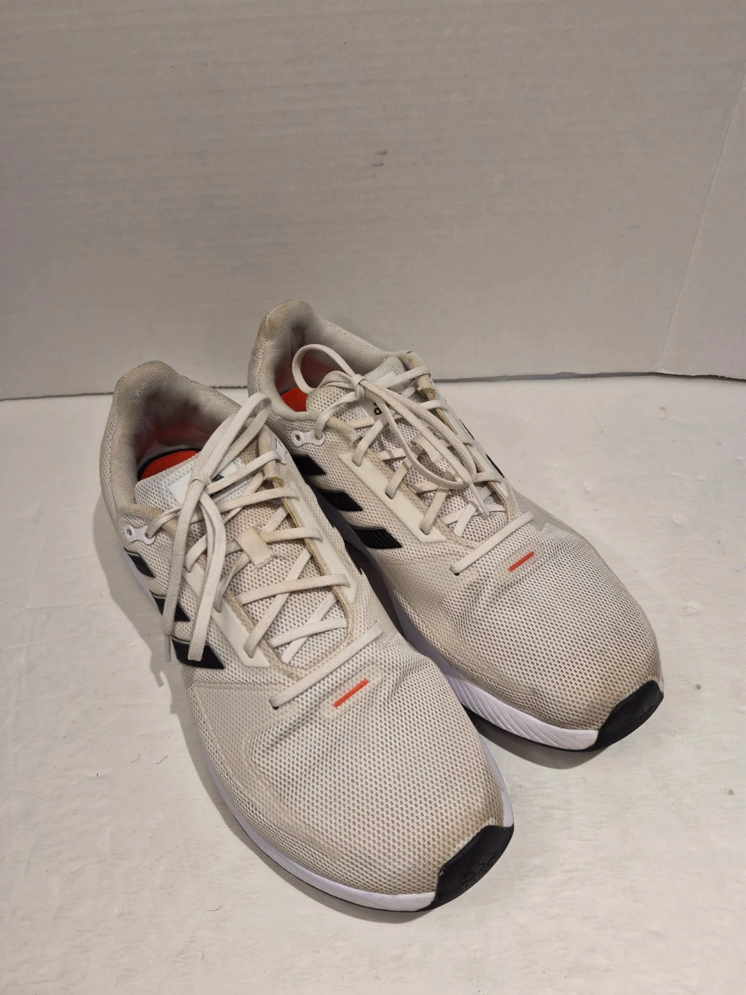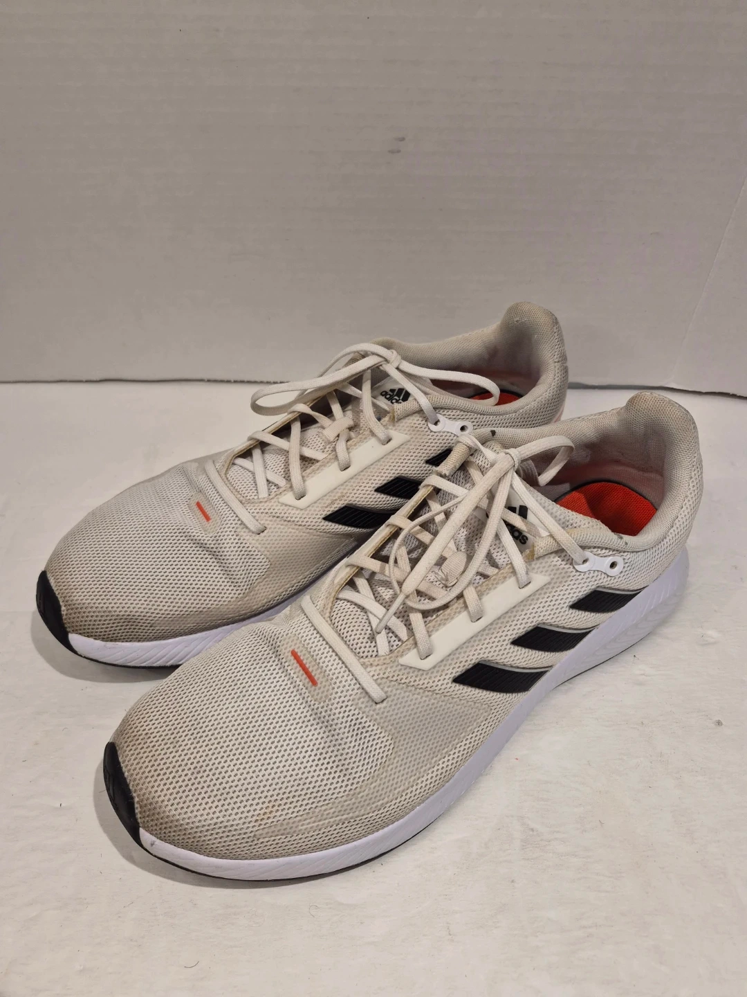 These Adidas running shoes are white with black accents. They feature a breathable mesh upper and a durable rubber sole. These shoes are great for everyday wear or light jogging.
