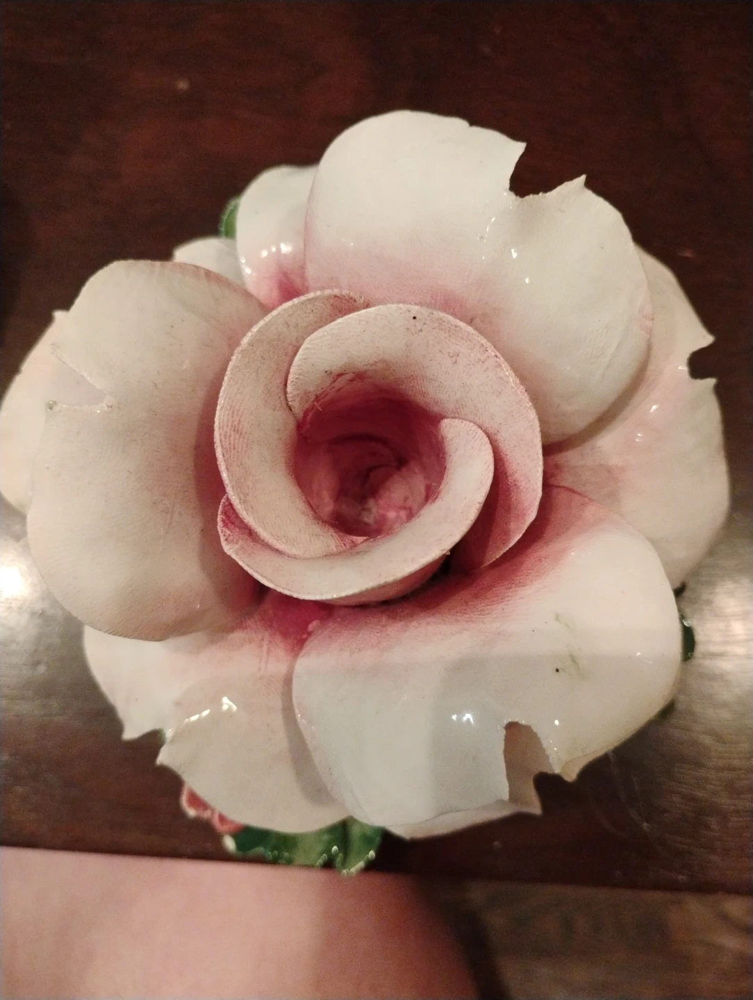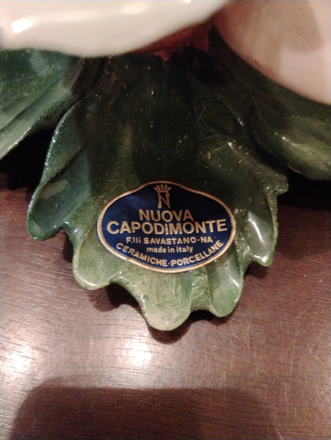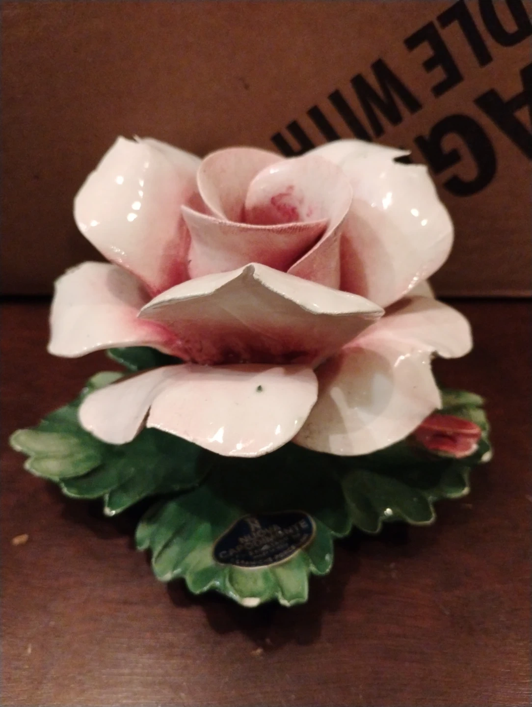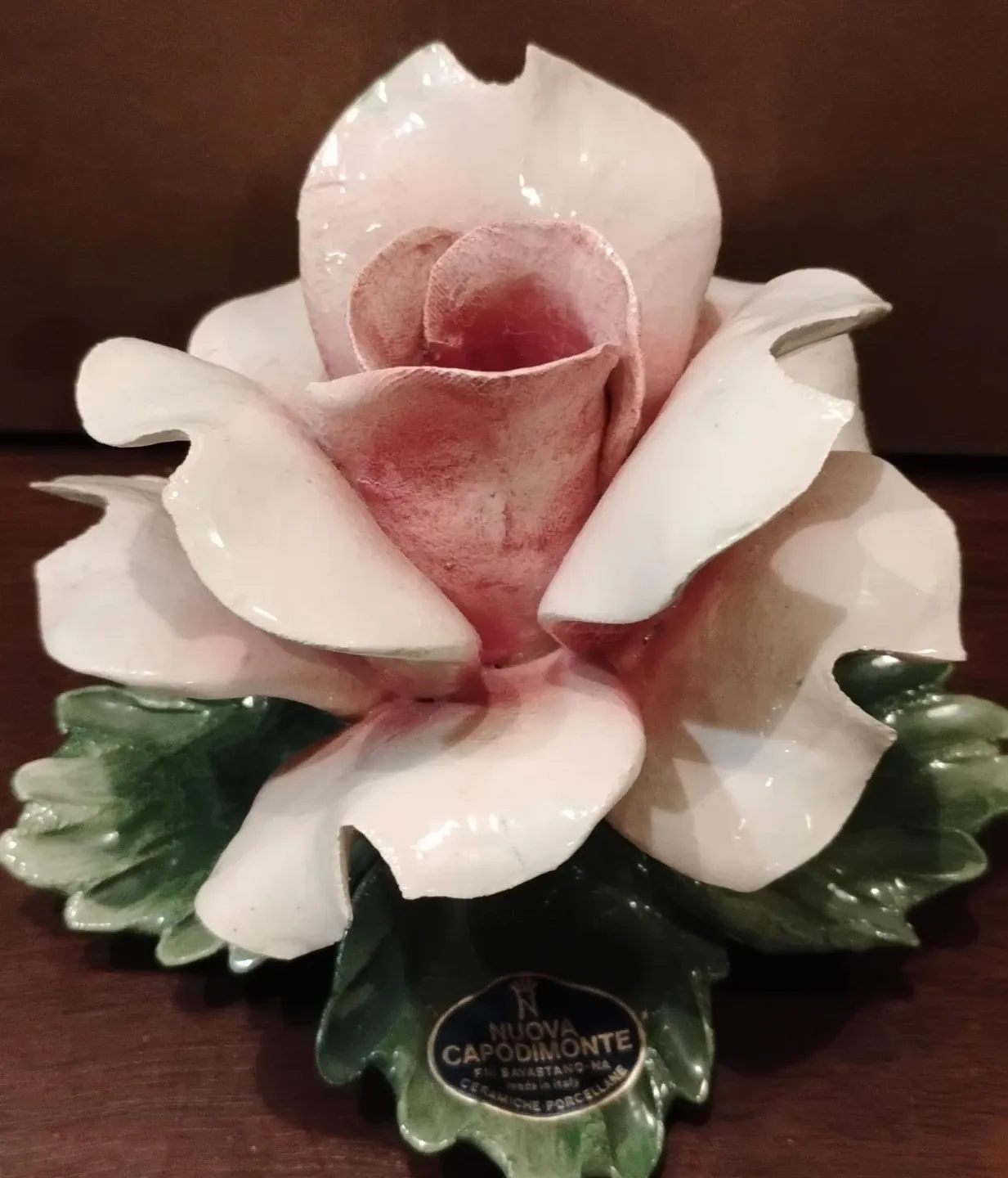 Beautiful handcrafted rose figurine made of porcelain. Features delicate pink and white petals with green leaves. Made in Italy by Nuova Capodimonte. I have 2 of them I will sell one for $25 or both for $40 each one has a little chip.in the leaf it shown in pictures above