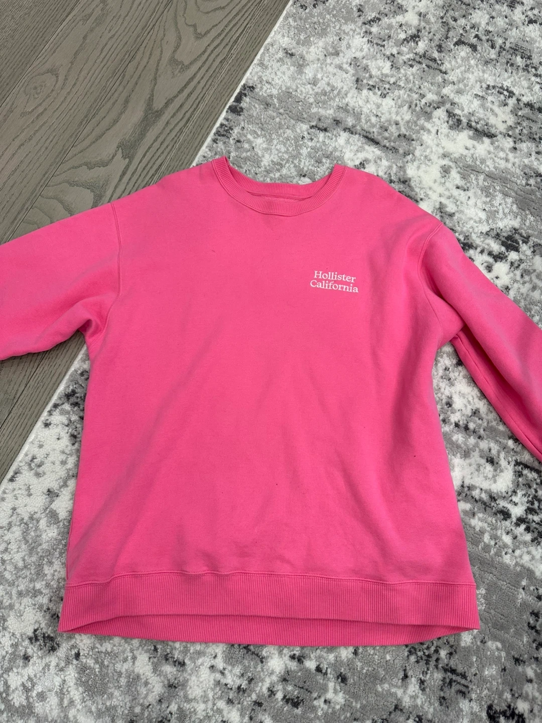 This is a pink crewneck sweatshirt from Hollister California. It's made of a soft cotton blend, perfect for casual wear. It's a comfortable layering piece for cooler days!