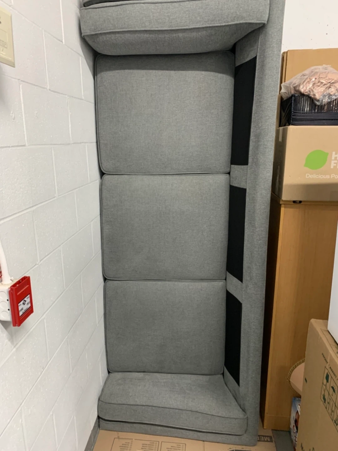 Grey fabric sofa seating with multiple cushions. The material is a durable fabric. Perfect for a small space or as additional seating.