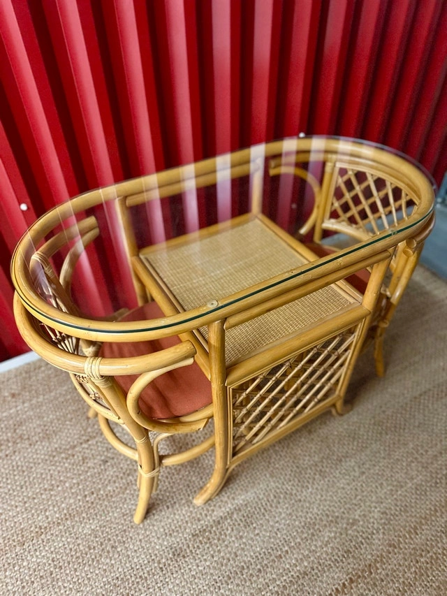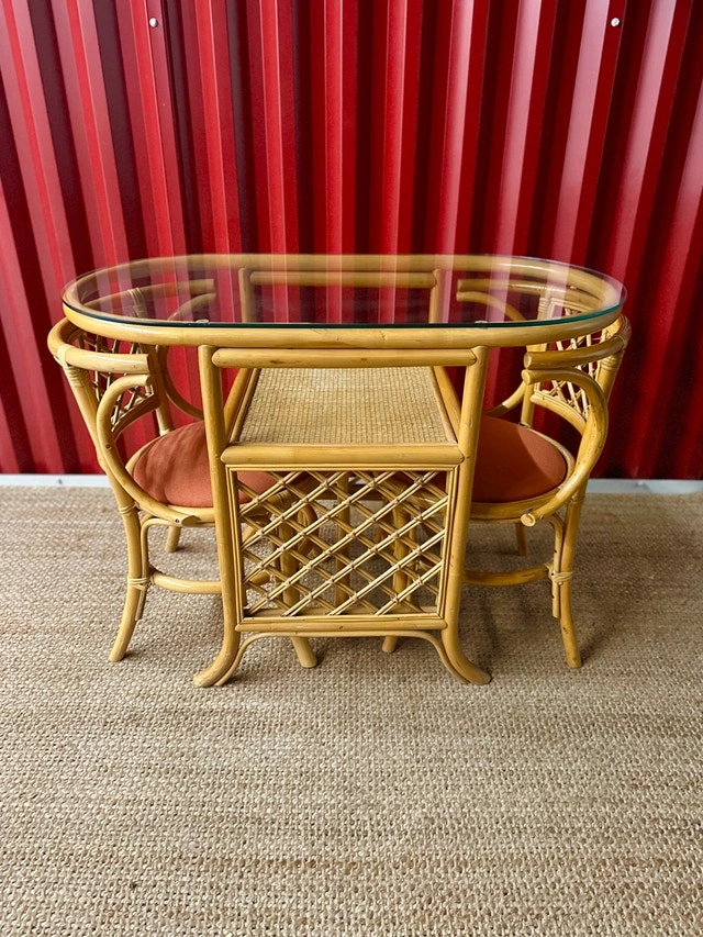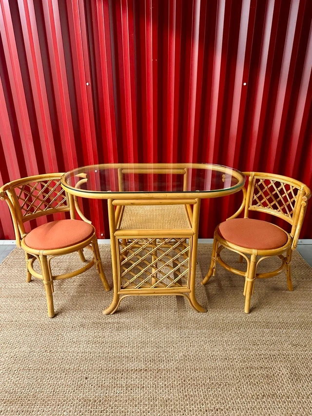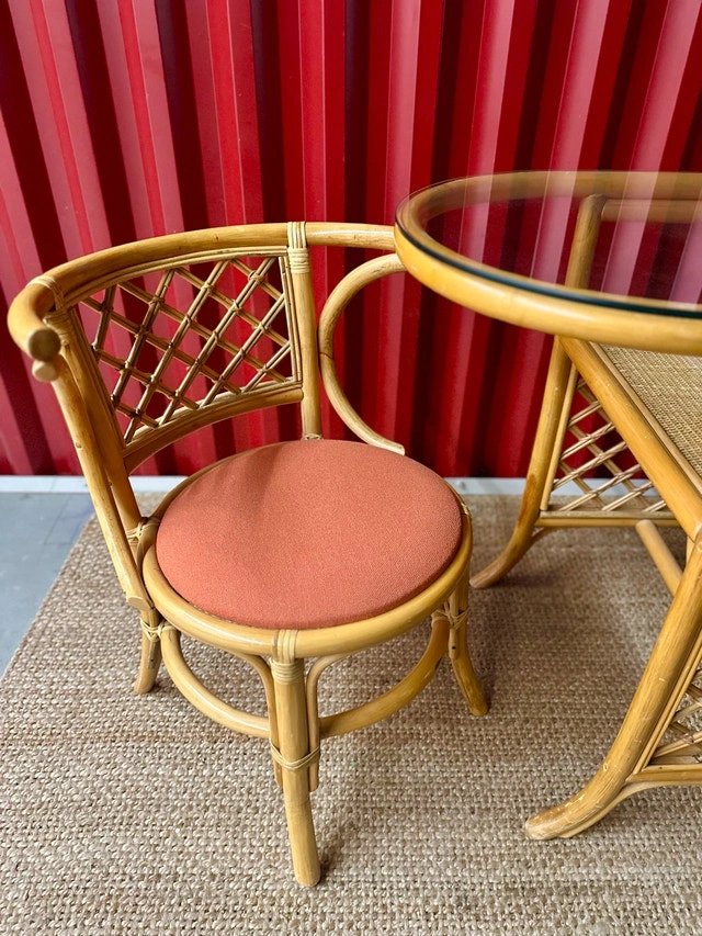 This set is in excellent vintage condition. Made from honeycomb colored rattan with a removable glass top. Chairs have been freshly reupholstered with a terracotta orange fabric. Some minor wear consistent with age.
