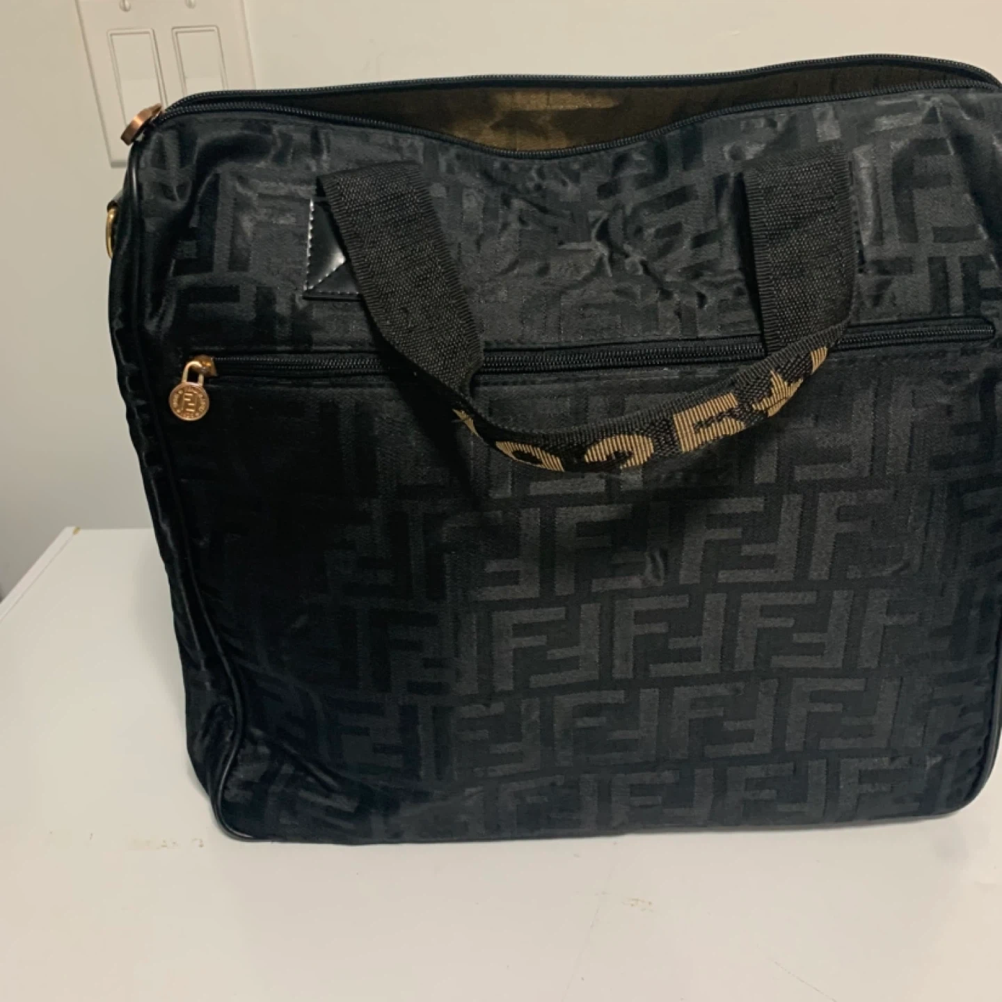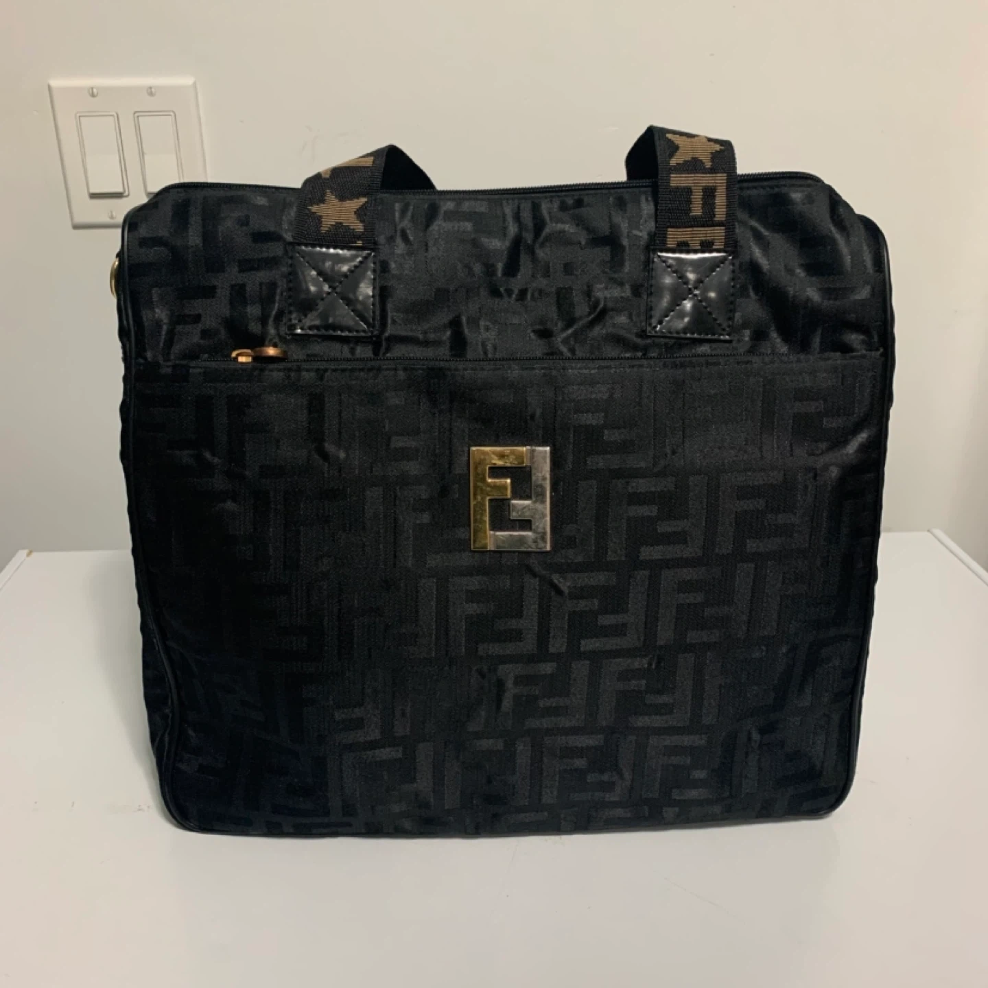 This black Fendi tote features the iconic Zucca pattern. It has two top handles and a zippered closure. An excellent choice for everyday use or travel!