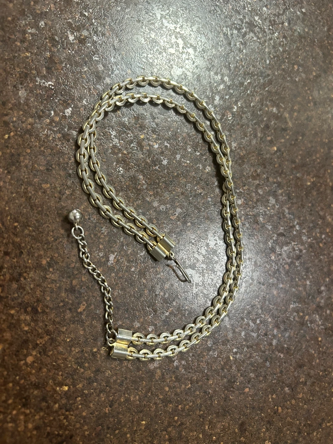 A simple silver chain necklace with a lobster clasp closure. The chain has a unique interlocking link design. Good for a slimmer neck, but can be used as a belt chain, scarf accessory, etc