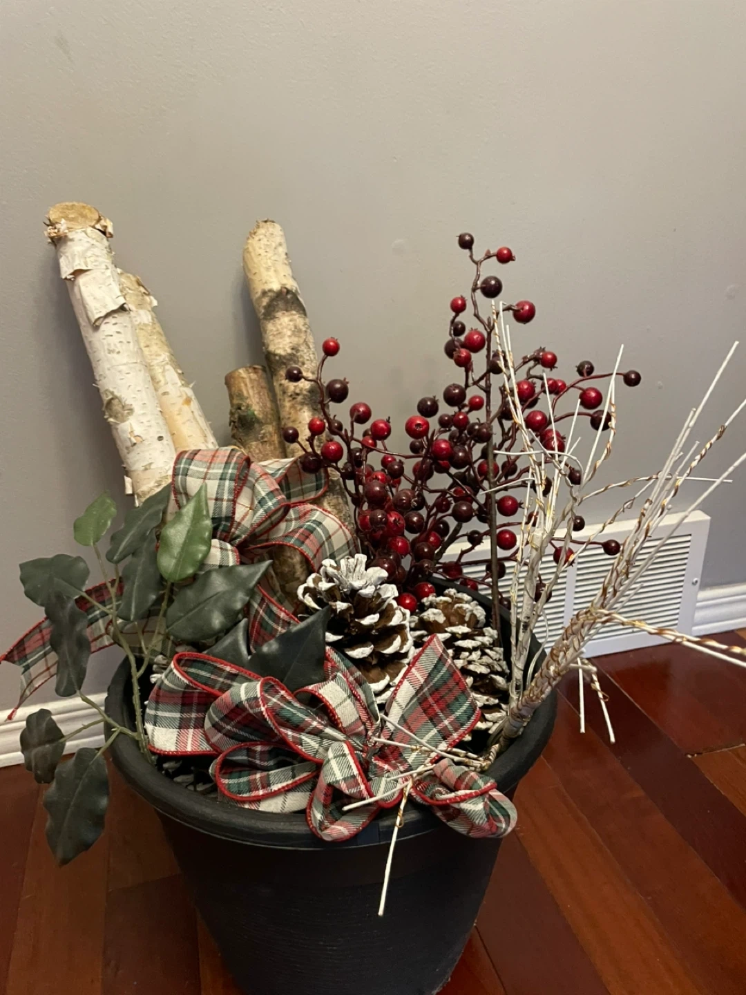 Everything you need to make your own festive arrangement featuring birch logs, red berries, pinecones, and plaid ribbon accents in a black pot. It's decorated with faux greenery and white twig-like elements. This decorative piece is perfect for adding a cozy, seasonal touch to your home during the holidays!