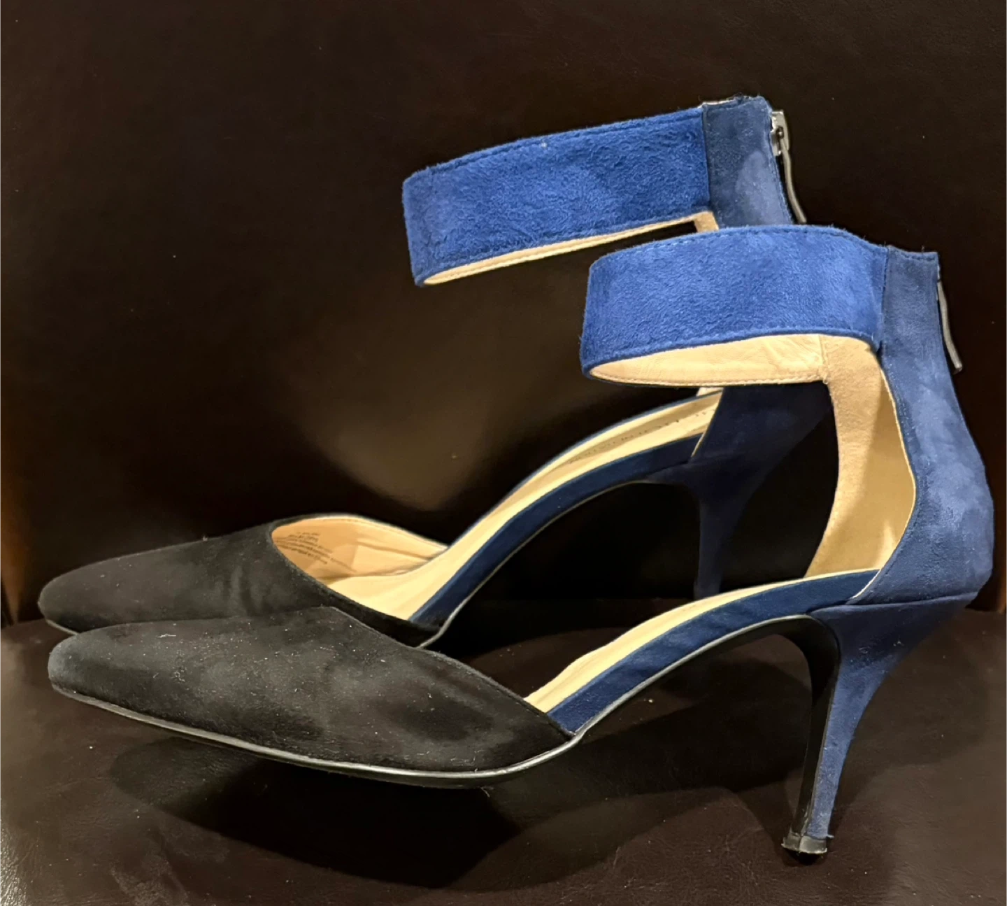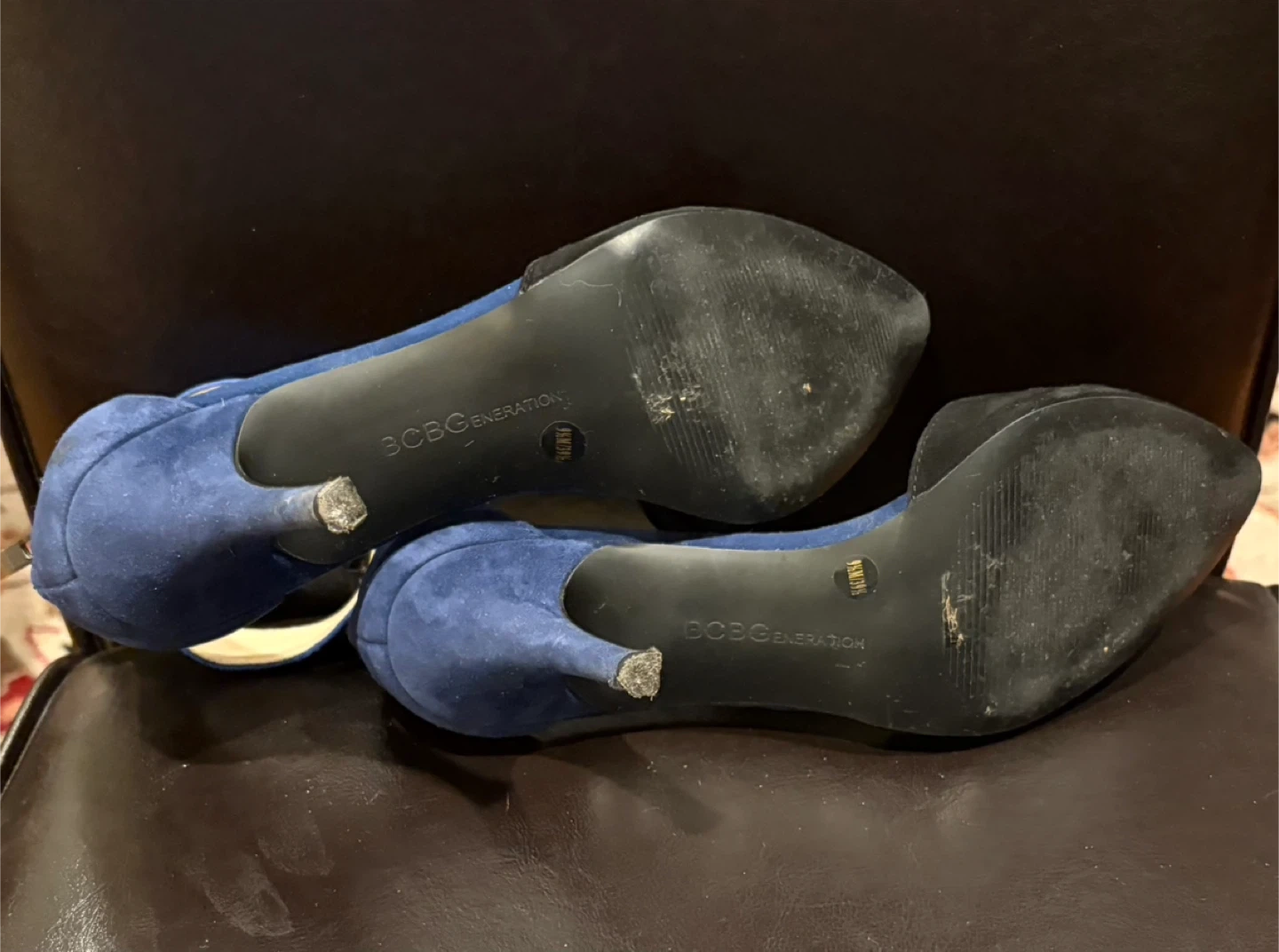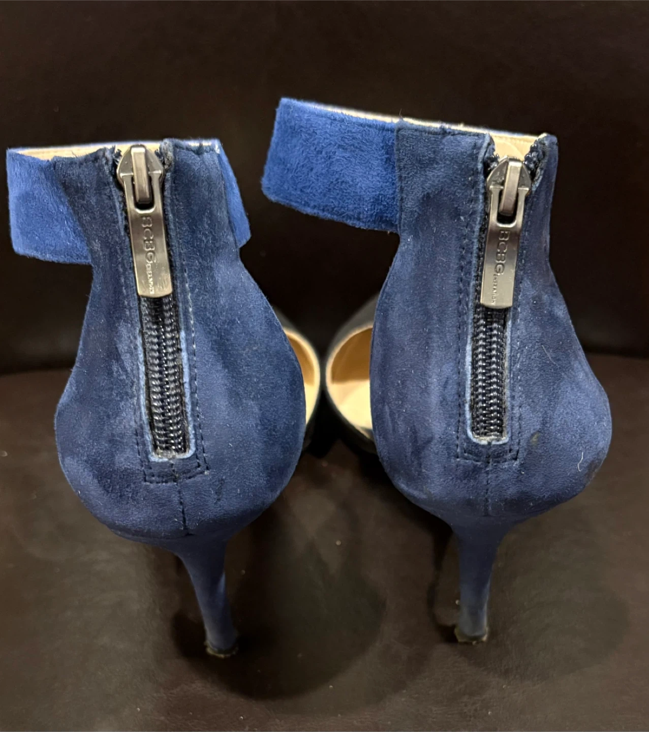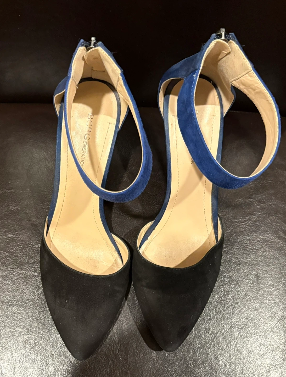 BCBGeneration women's heels with a stylish ankle strap design. These shoes feature a pointed toe and a combination of black and royal blue suede-like material. They come with a back zipper for easy on and off. Heel height 3 inches. A great choice for adding a pop of colour and sophistication to your outfit! Size 9.5. Pick up only. Cash only, no e-transfers.