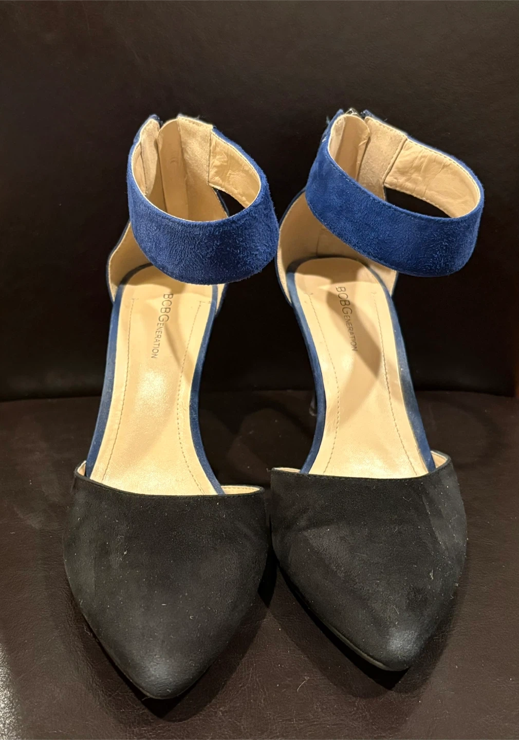 BCBGeneration women's heels with a stylish ankle strap design. These shoes feature a pointed toe and a combination of black and royal blue suede-like material. They come with a back zipper for easy on and off. Heel height 3 inches. A great choice for adding a pop of colour and sophistication to your outfit! Size 9.5. Pick up only. Cash only, no e-transfers.