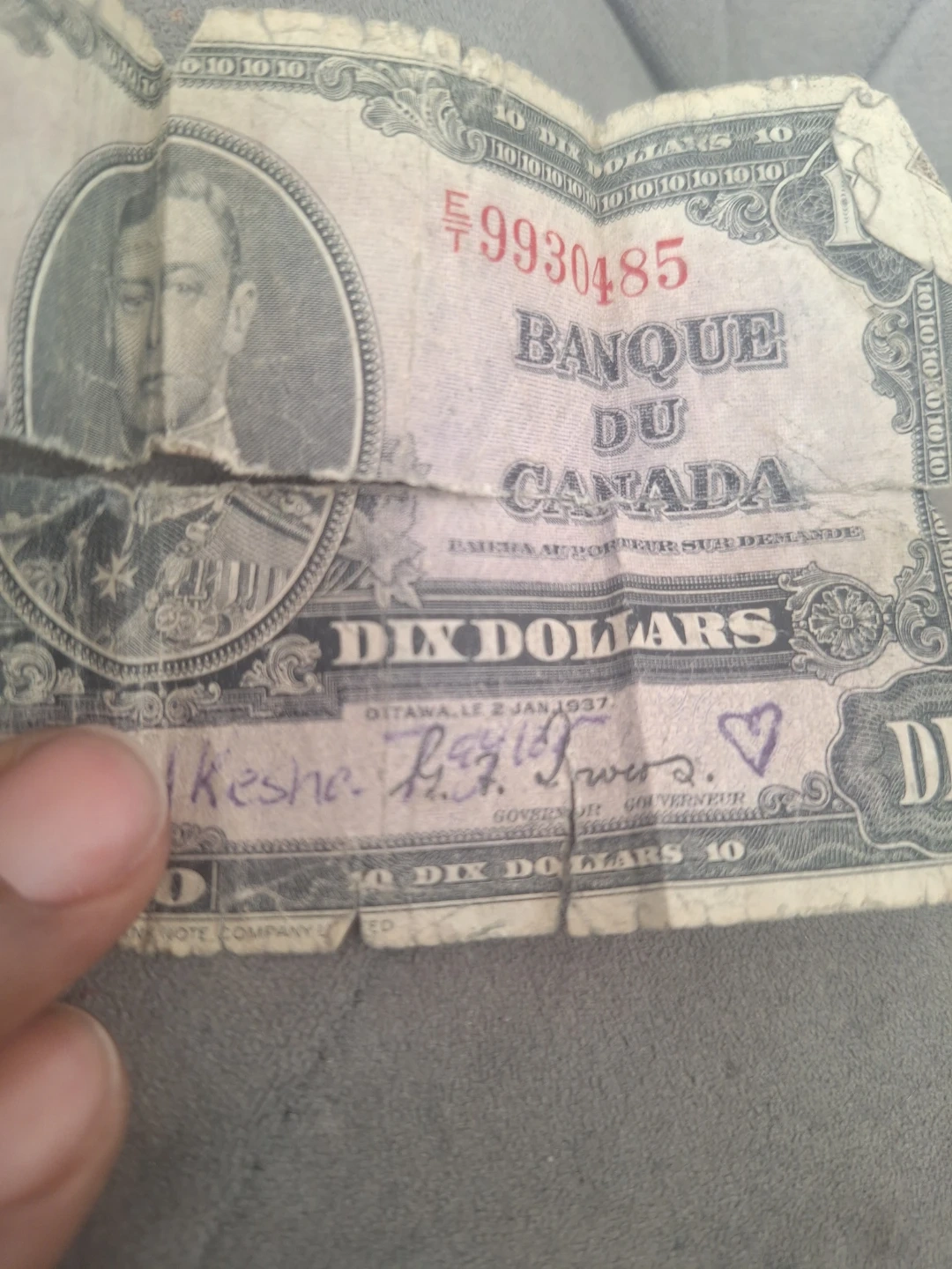 This is a 1937 Bank of Canada ten-dollar bill. It features King George VI and was printed in Ottawa. The bill shows signs of wear and tear consistent with its age. Make an offer, let's discuss.