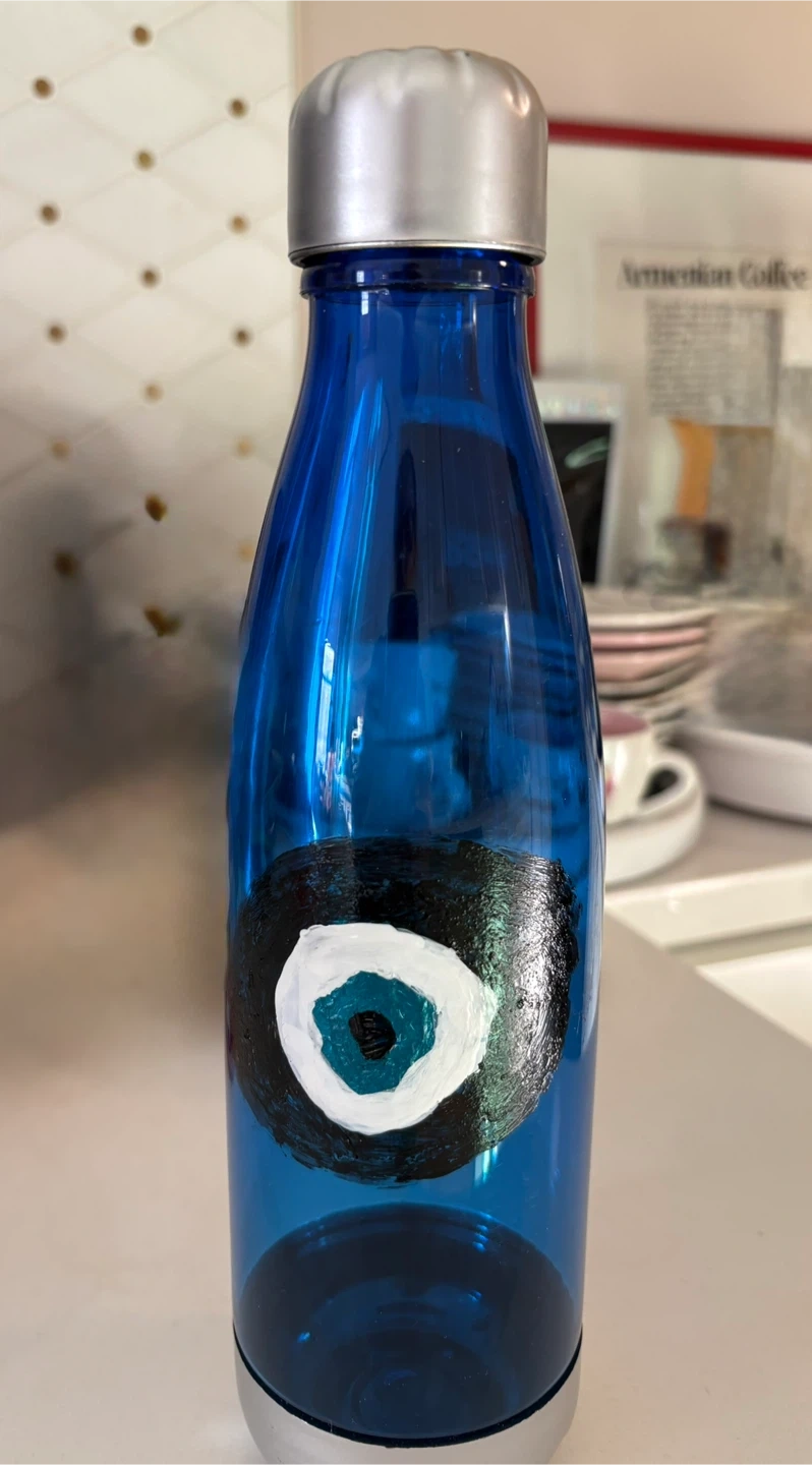 Blue reusable water bottle with a painted evil eye design. It's made of durable plastic with a silver screw-on cap. Great for on-the-go hydration!