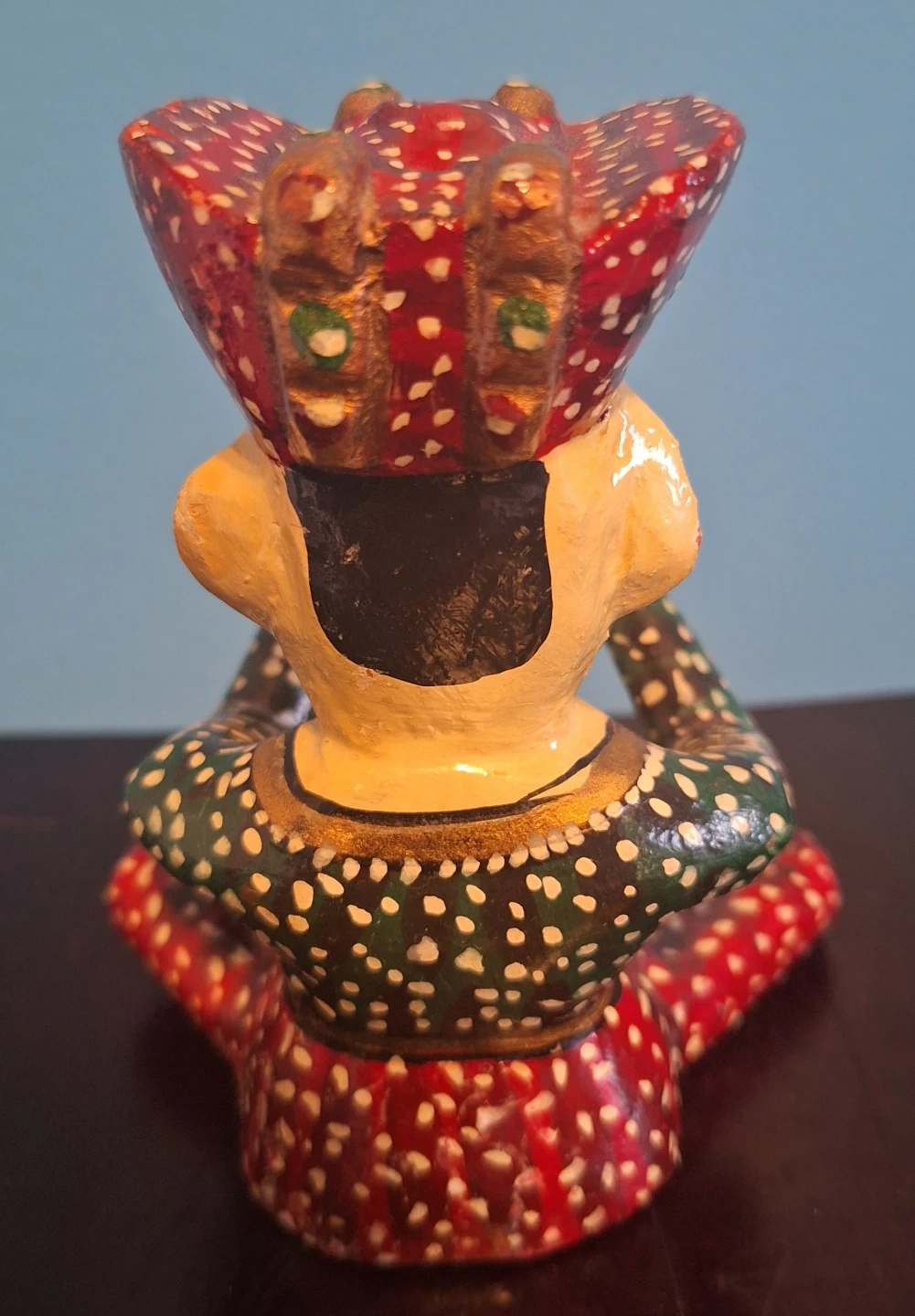 Vintage Indian wooden figurine of Rajasthani musician. Hand carved and hand painted. It's a unique piece with intricate details and vibrant colours. Perfect for adding a touch of cultural charm to your home decor! 4.5 inches tall