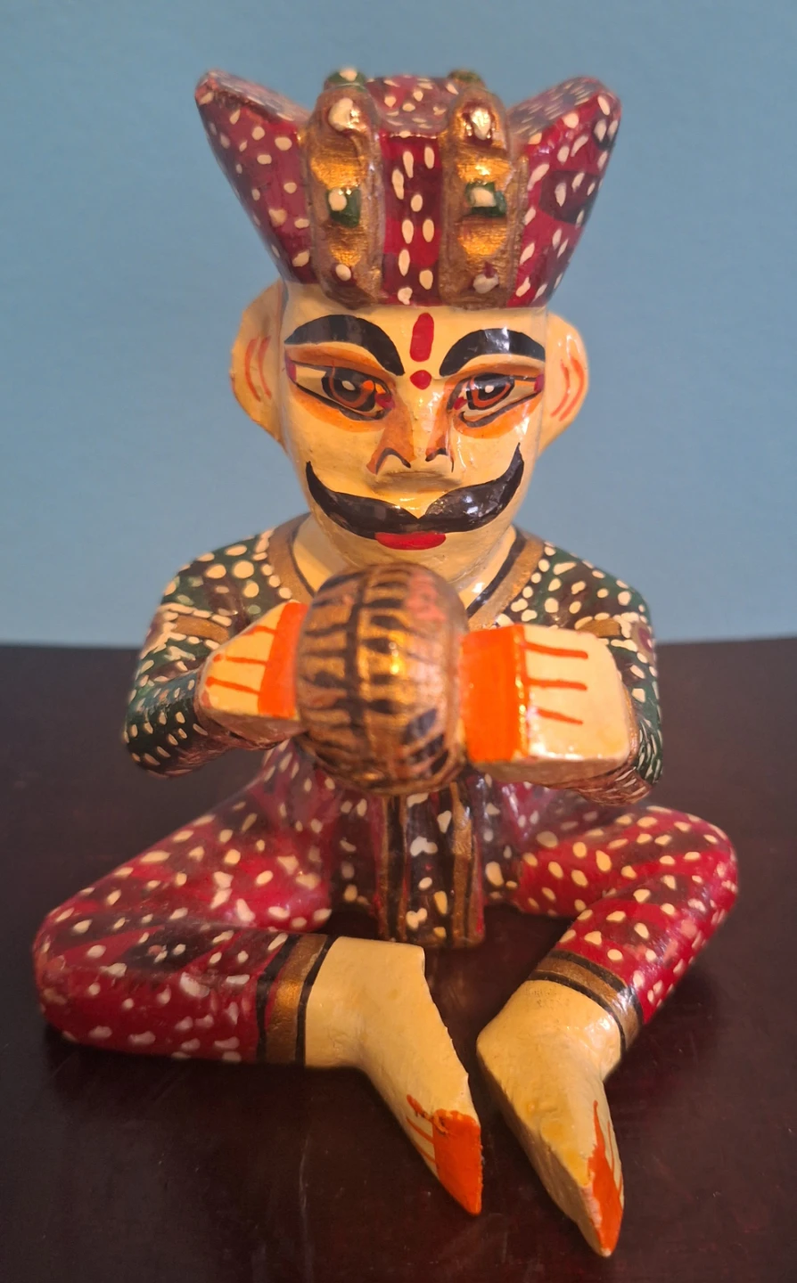Vintage Indian wooden figurine of Rajasthani musician. Hand carved and hand painted. It's a unique piece with intricate details and vibrant colours. Perfect for adding a touch of cultural charm to your home decor! 4.5 inches tall
