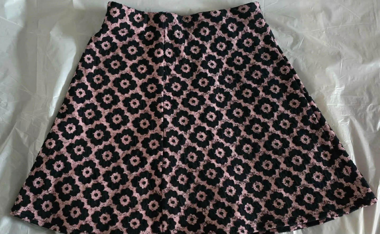 Cute pink and black A-line skirt with a floral pattern. It's made of a soft, textured knit fabric. A fun addition to your wardrobe!
