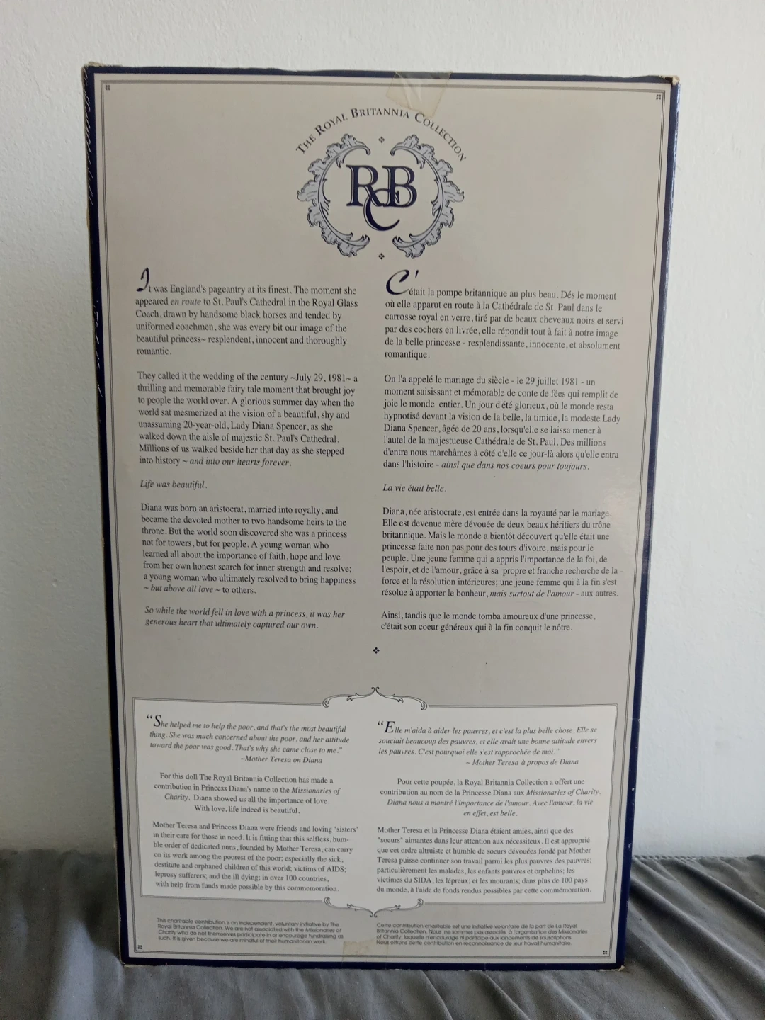 This is the original commemorative doll from The Royal Britannia Collection. It features the iconic wedding dress worn by Diana. The doll is presented in its original box. For ages 8 and up.