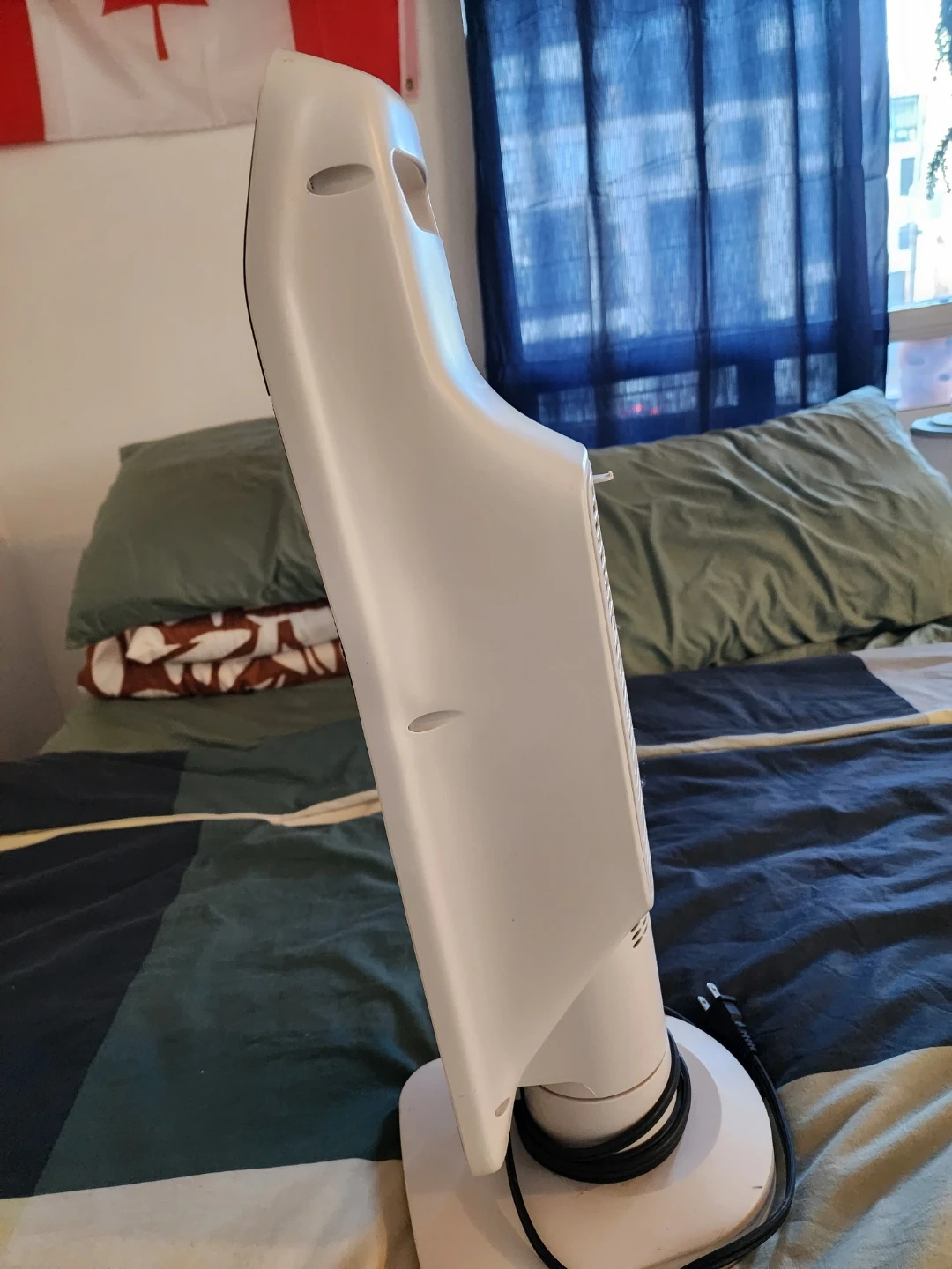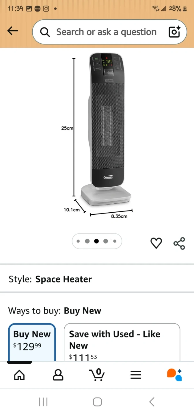 This DeLonghi space heater uses ceramic technology for efficient heating. It's white and includes a remote control. Dimensions are 25cm H x 10.1cm W x 8.35cm D.