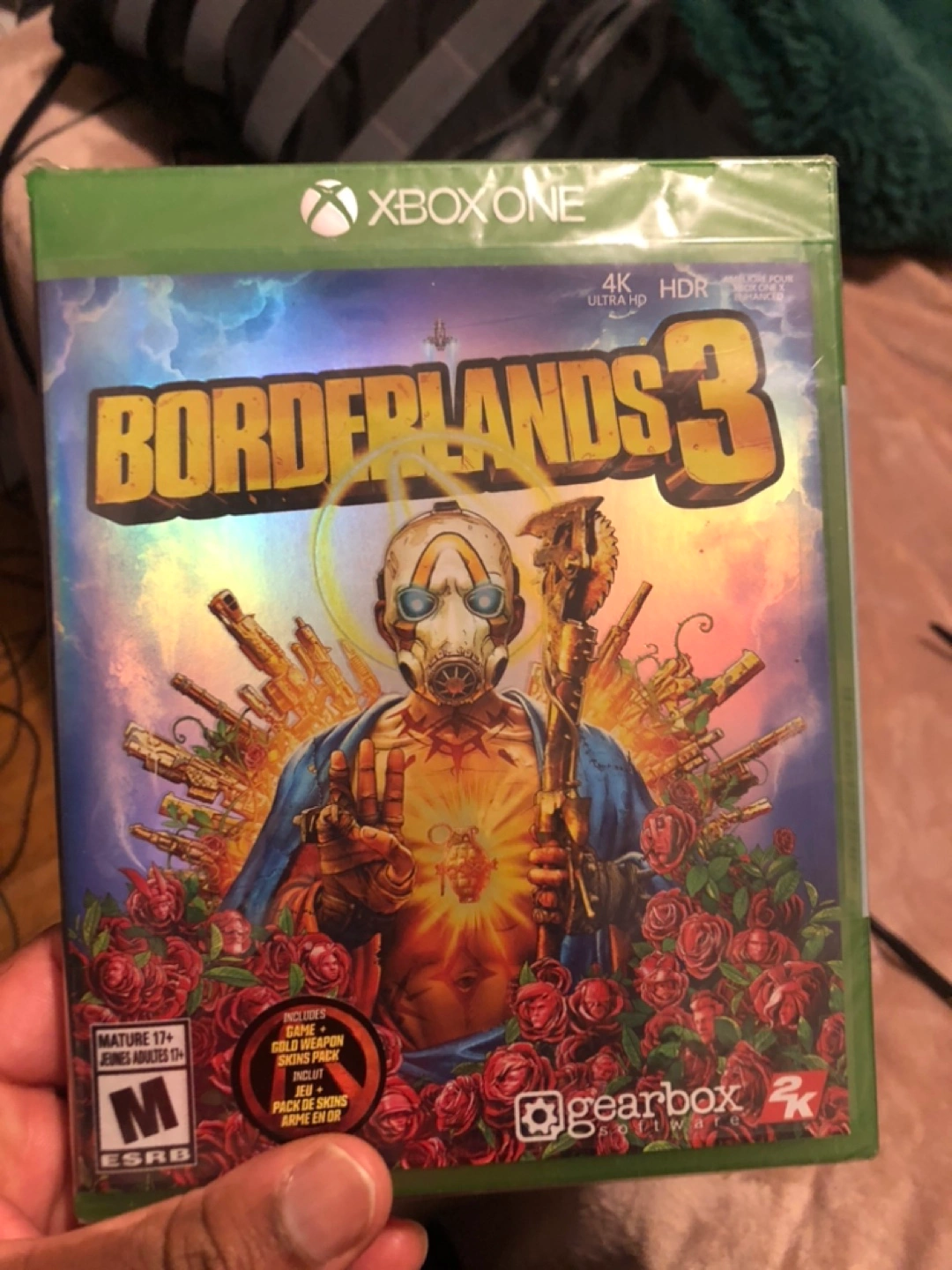 This is Borderlands 3 for Xbox One. It supports 4K HDR Ultra HD. Includes the game and a gold weapon skins pack. Great for fans of action-adventure shooters!