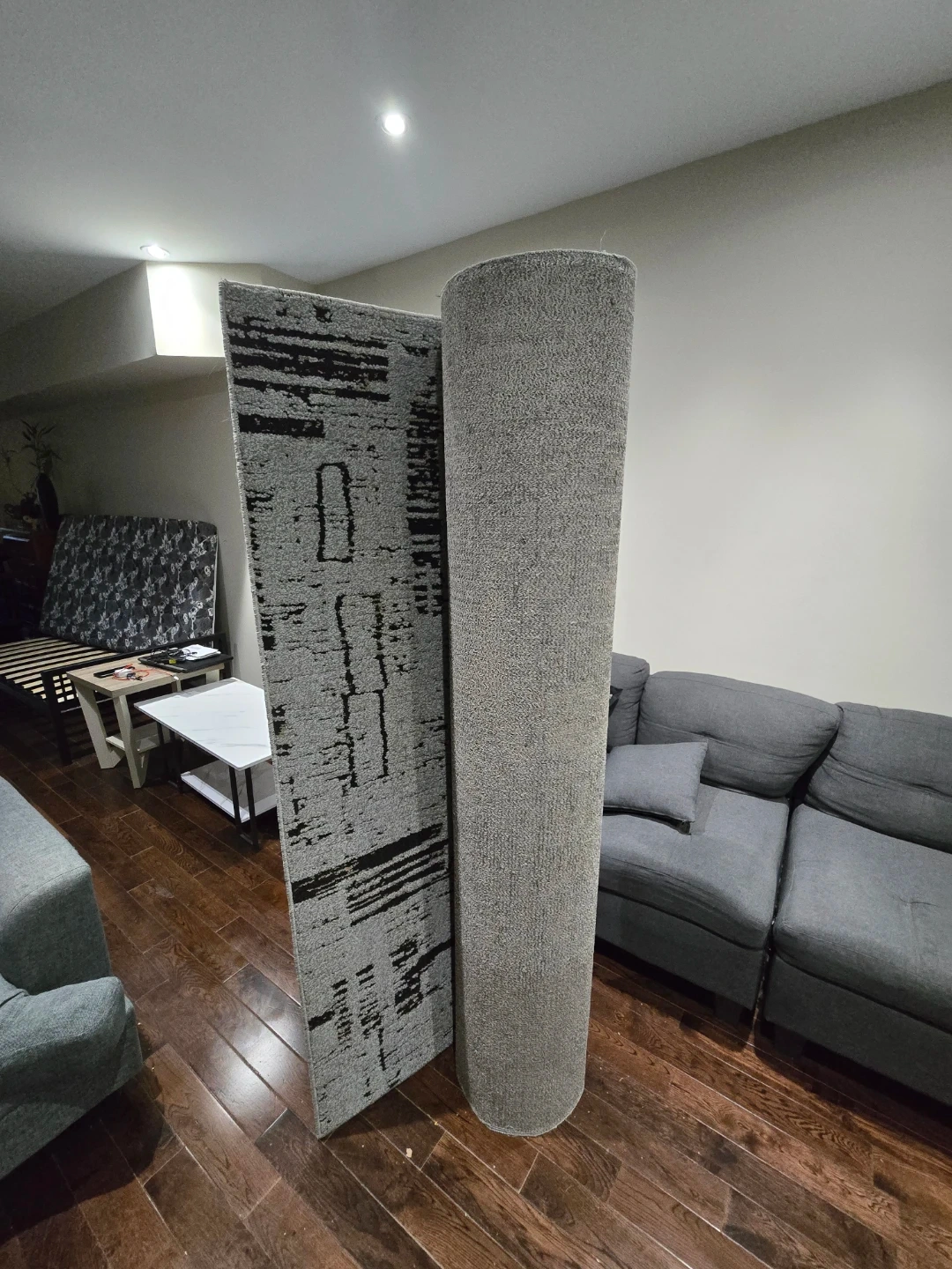 This is a rolled area rug featuring a grey and black abstract pattern. It's suitable for adding a modern touch to any room. The material appears to be a durable synthetic fiber.