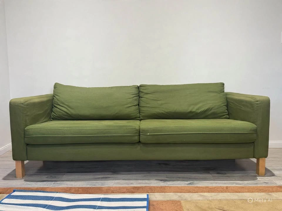 Green fabric sofa with light wood legs and removable cushion covers. This IKEA Karlstad model is upholstered in a durable olive green textile. Dimensions (WxDxH): 80 x 36 x 31 in.