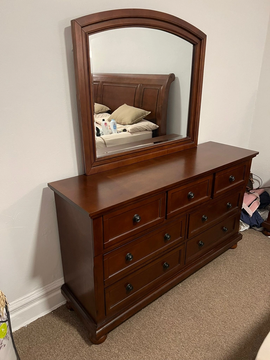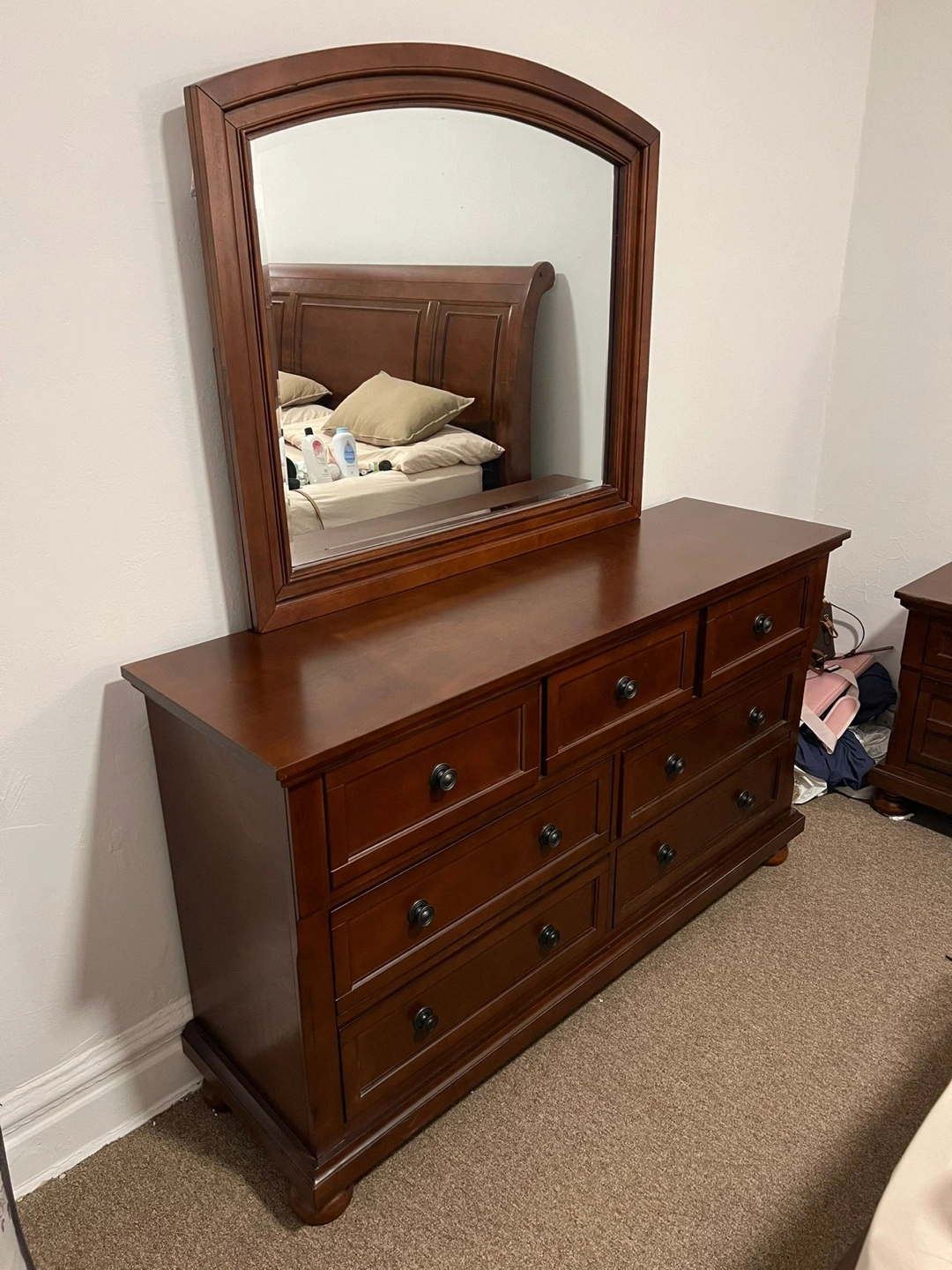 Selling a bedroom set that includes a bed frame, a dresser with a mirror, and two nightstands. The set is a rich brown color and is in good condition. Perfect for furnishing a bedroom with a matching set!