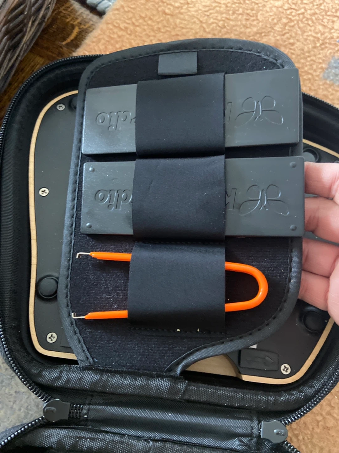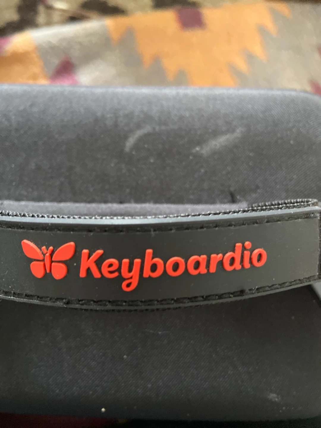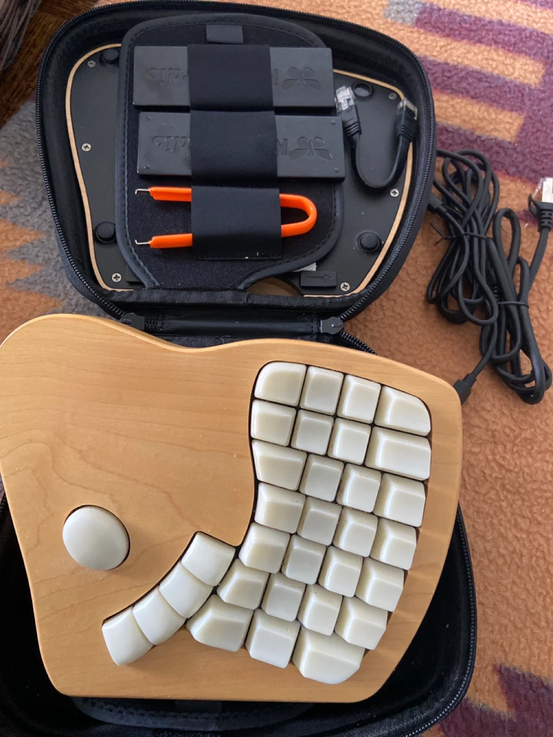 This is a split ergonomic keyboard from Keyboardio. It features a wooden construction and comes with its original carrying case and accessories. The keyboard includes cables for connectivity. As is