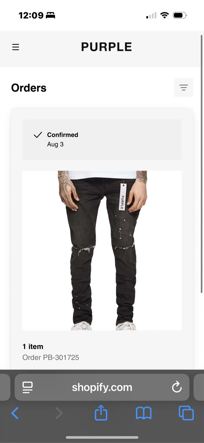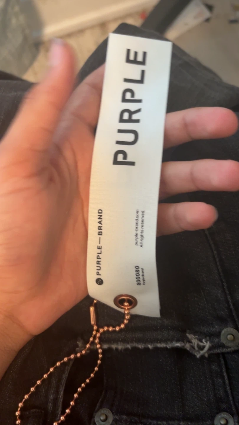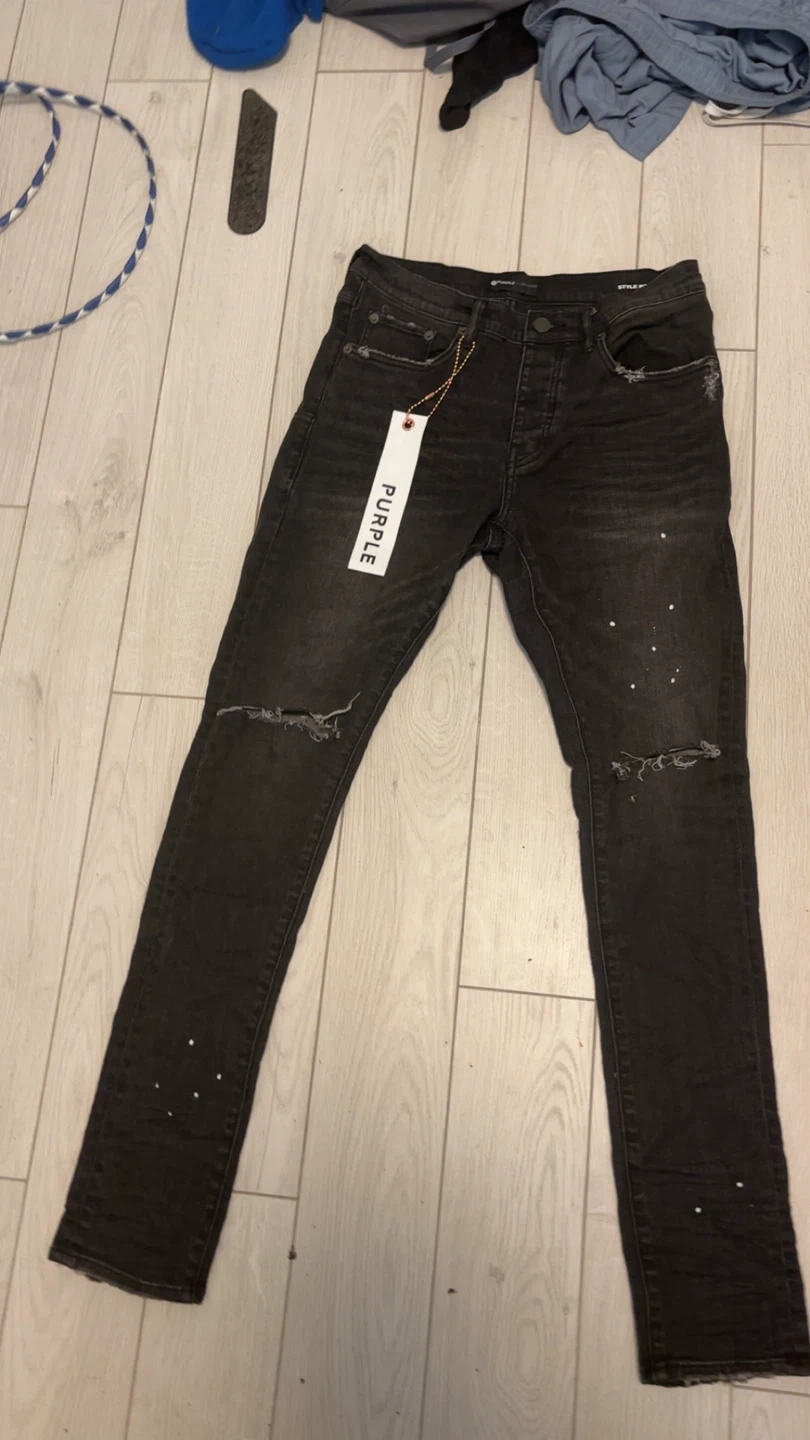 These are distressed black jeans from Purple Brand. They feature a white splatter paint design. The jeans have a button fly closure and a slim fit. A perfect addition for a streetwear-inspired wardrobe!