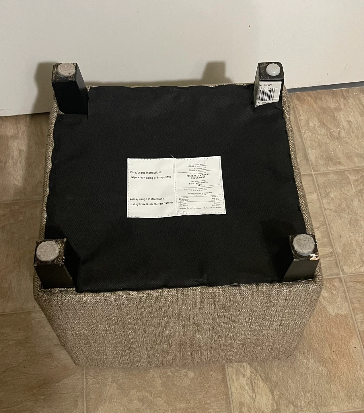A comfortable square upholstered footstool in a neutral beige linen-look fabric. Strong and sturdy. It has four short, dark wooden block feet. Adds a touch of comfort and style to any room. Excellent condition. From smoke-free, pest-free, and pet-free home.