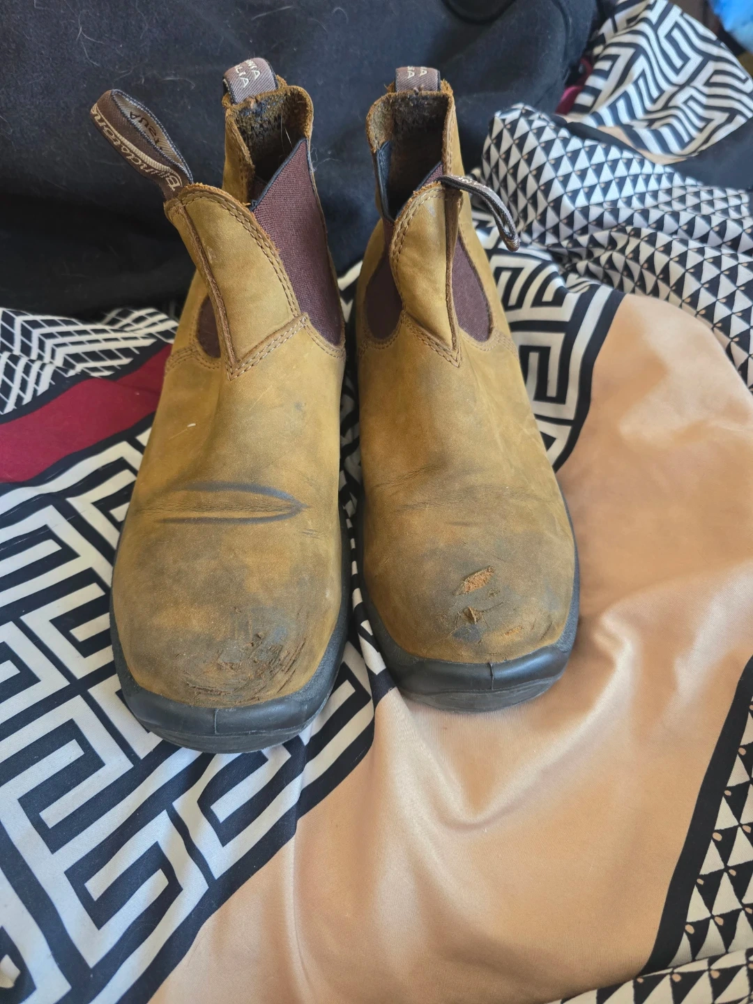 These are Blundstone Chelsea boots in a brown leather. They feature elastic side panels for easy on and off. The soles are sturdy and designed for work or everyday wear. Steel toe boot. Additional inserts for comfort. Some wear on the toes but still completely usable. And Blundstone does offer lifetime warranty on their boots. Boots were used 7 months.