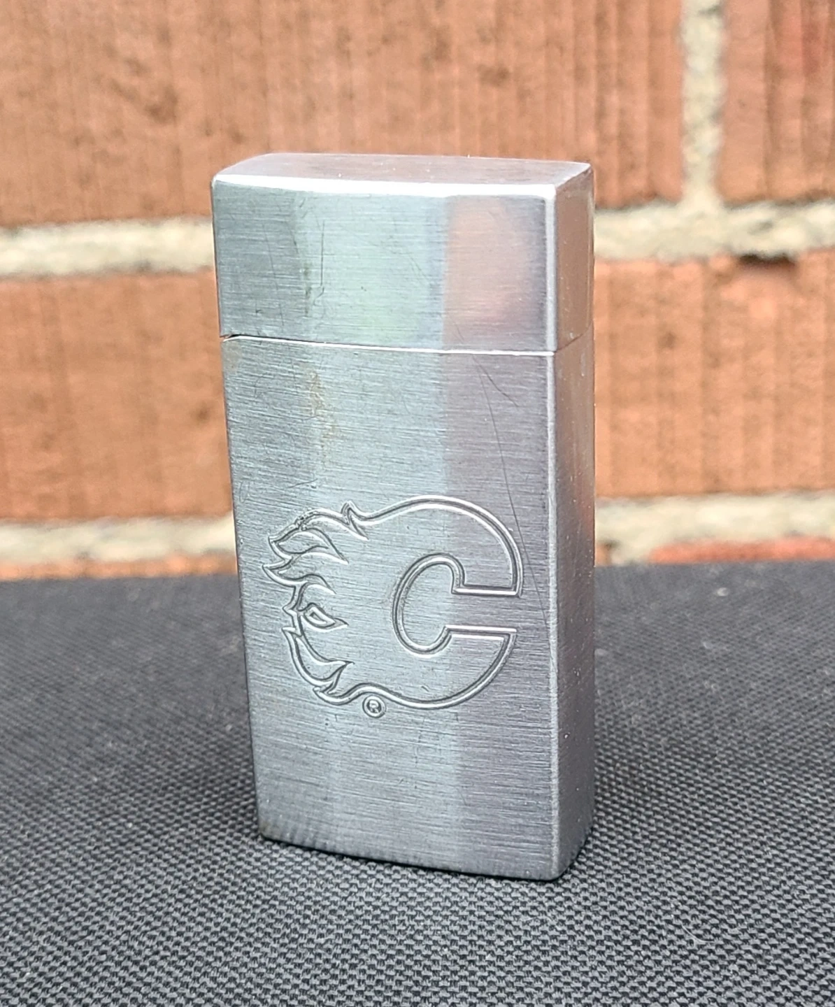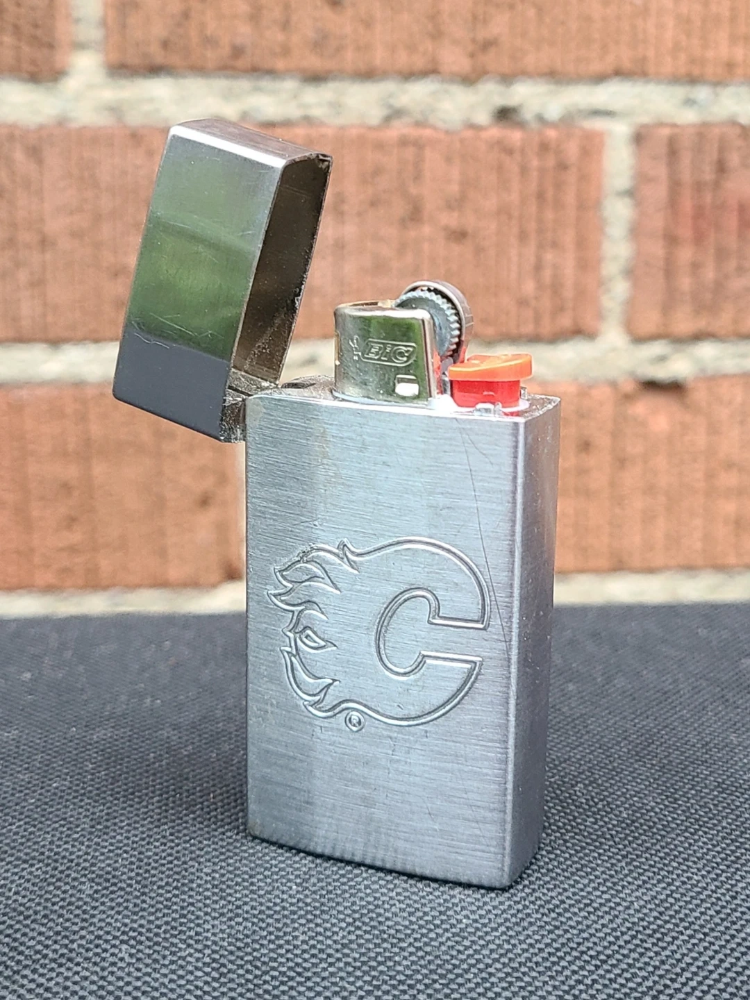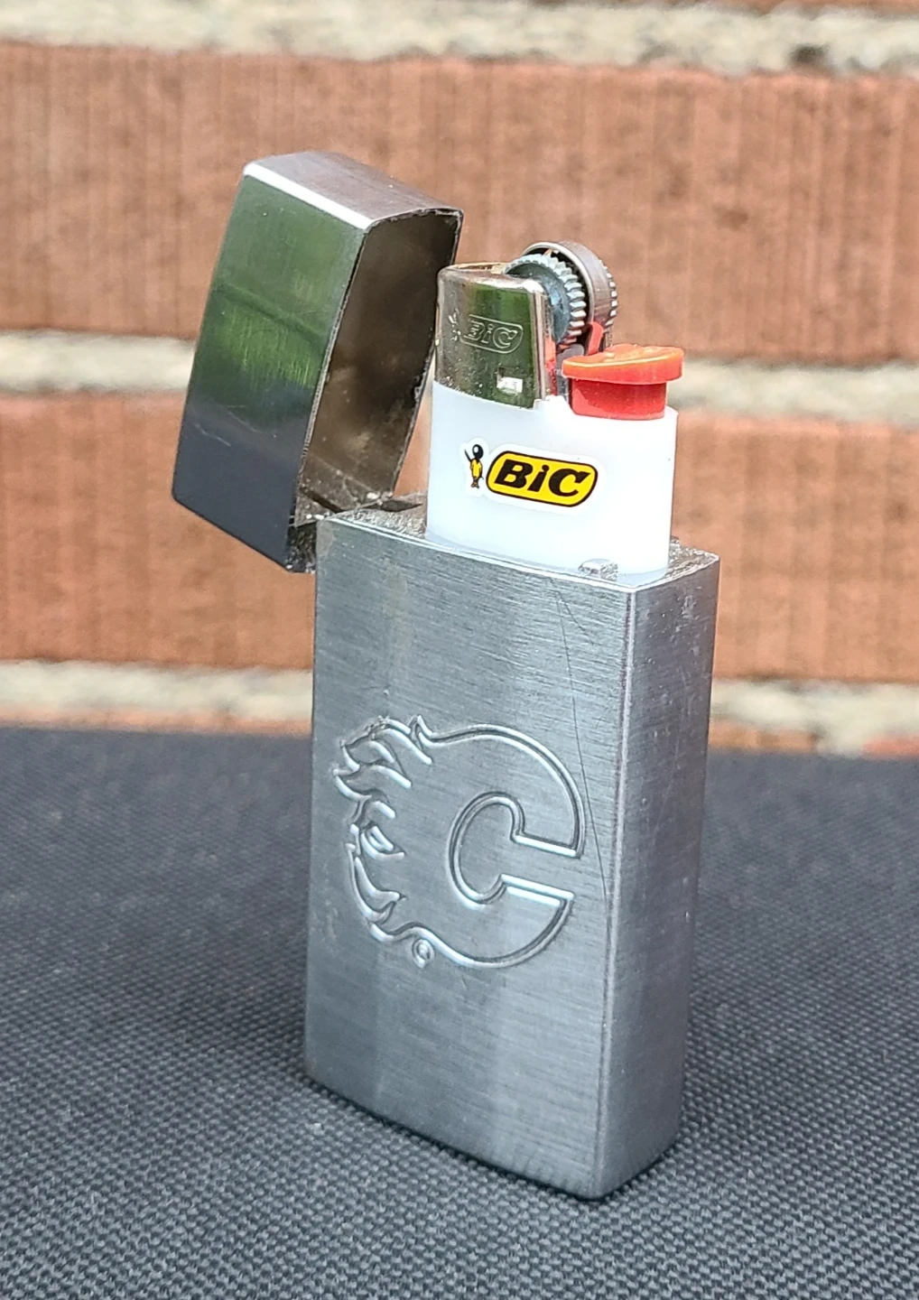 Silver metal case with NHL Calgary Flames logo. Flip top, Zippo style case, holds a Mini Bic lighter.