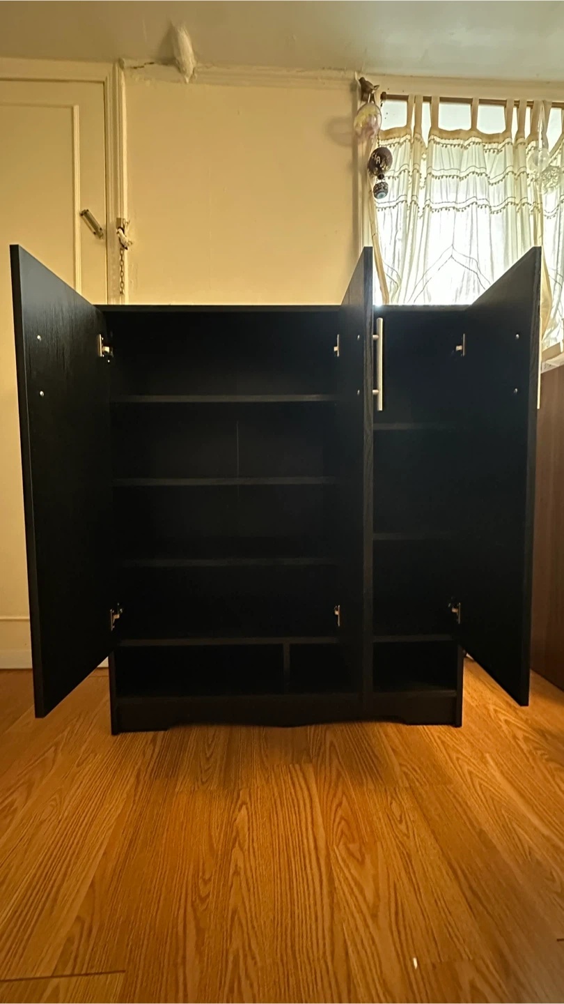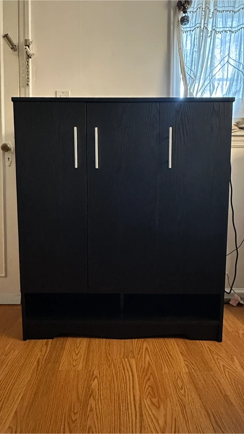 This is a black cabinet with three doors and multiple shelves. It's made of wood composite and features a modern design. Ample storage space is available inside.