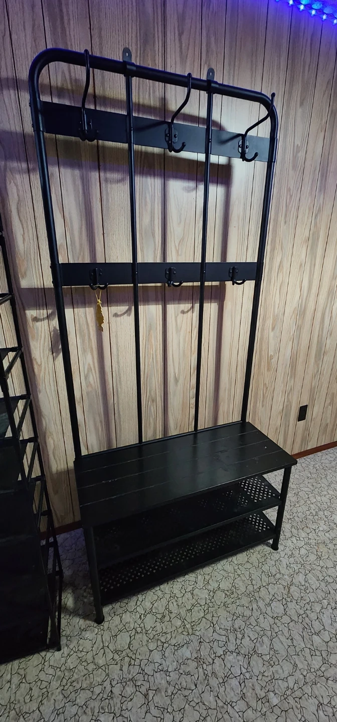 This black metal hall tree features a bench with two lower shelves for storage and multiple hooks up top for coats and hats. It's a functional entryway organizer! This piece is useful for keeping your foyer tidy. It's great for shoes and outerwear.