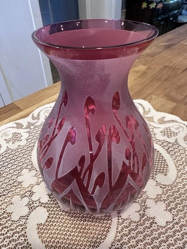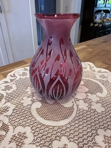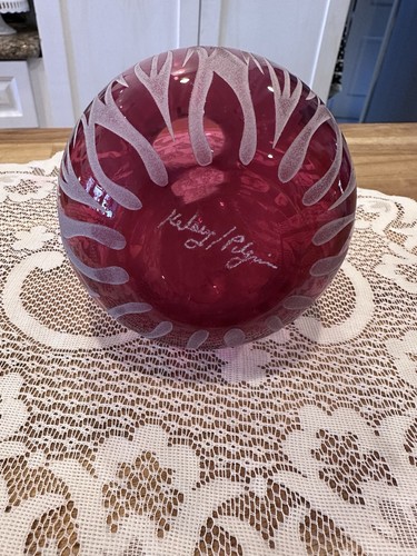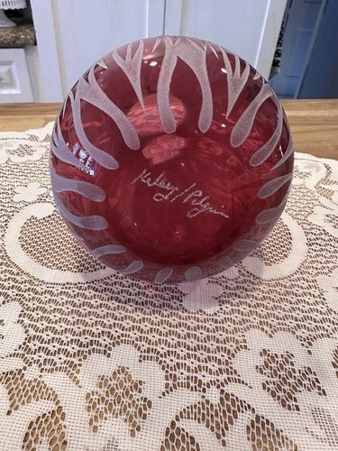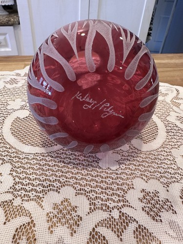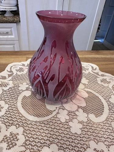 This frosted cranberry sand-carved glass vase by artist Kelsey Murphy is a vintage piece from the late 20th century. Handmade in the United States, this art glass vase features intricate carvings and is signed by the artist. With its unique design and high-quality craftsmanship, this vase is a beautiful addition to any home decor, showcasing the artistry of American glassmaking in the 1990s.