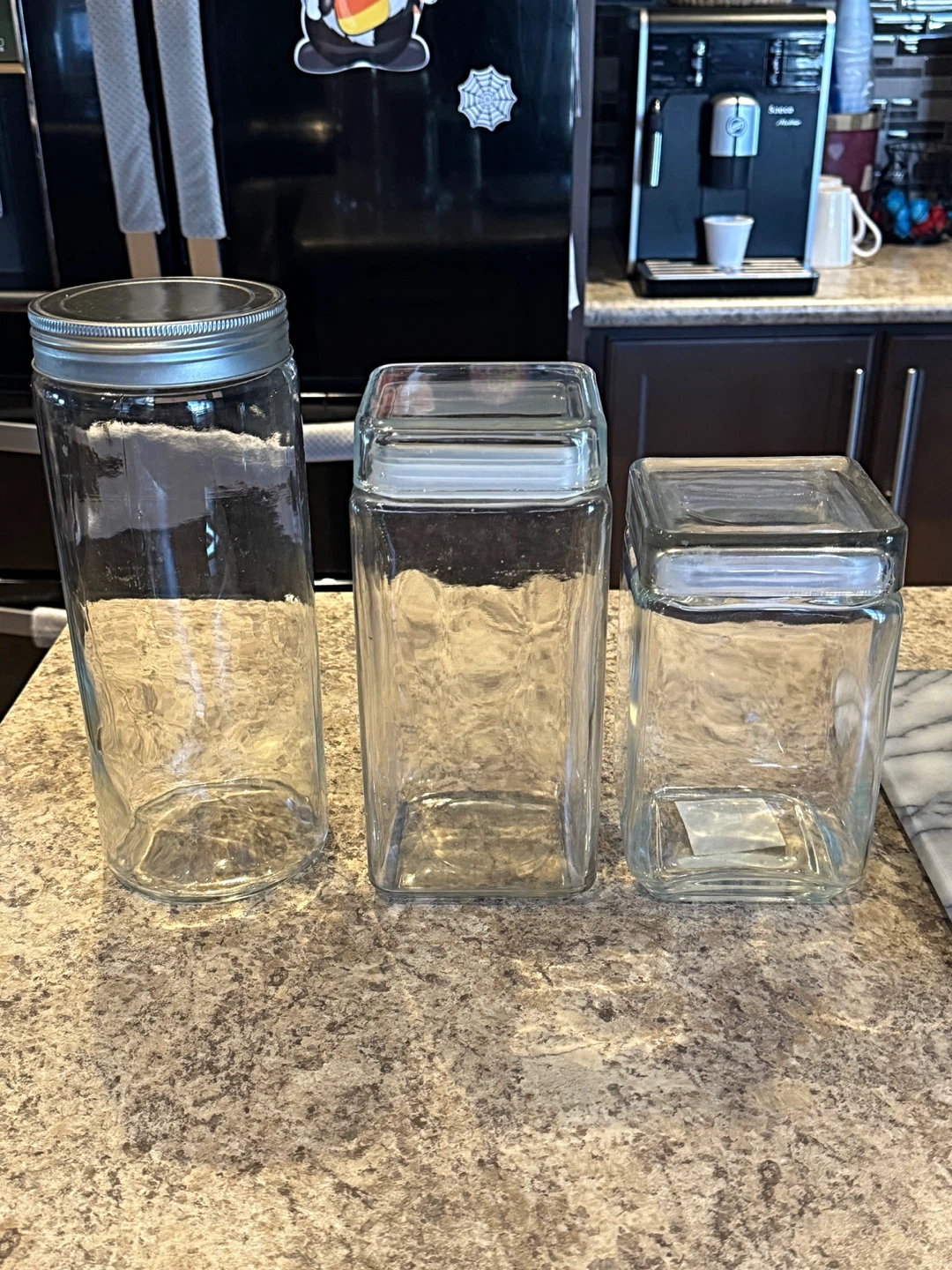 Selling a set of 3 glass kitchen jars. They're perfect for storing all sorts of things in your pantry or on your countertop. They're in great shape!