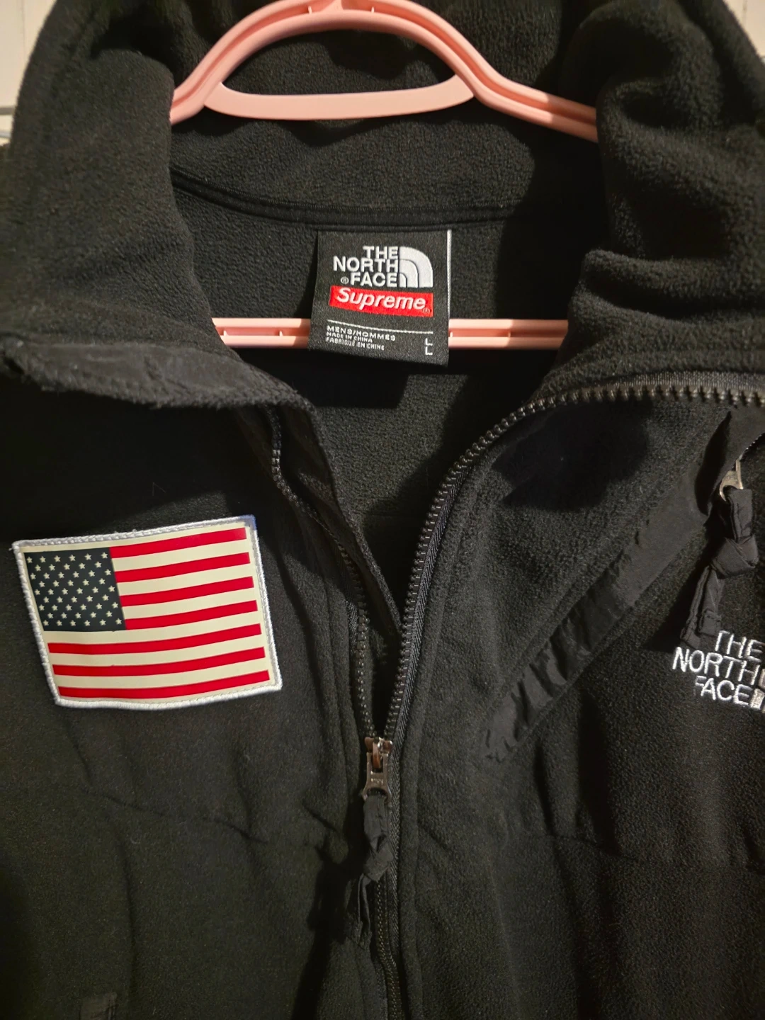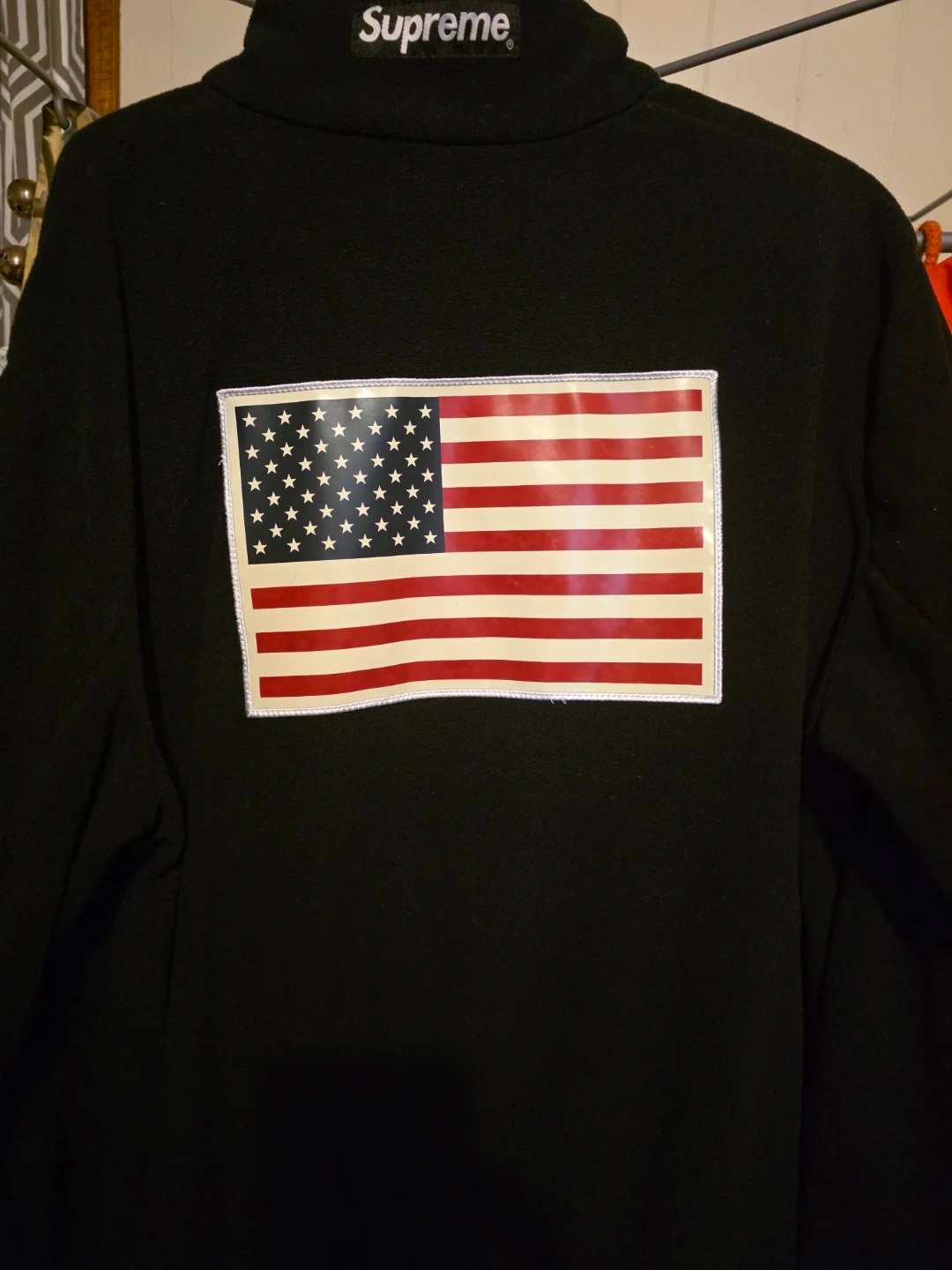 Black fleece jacket with US flag patches on front and back. Features "Supreme" branding on the sleeve and collar. Size L. Perfect for cooler weather!