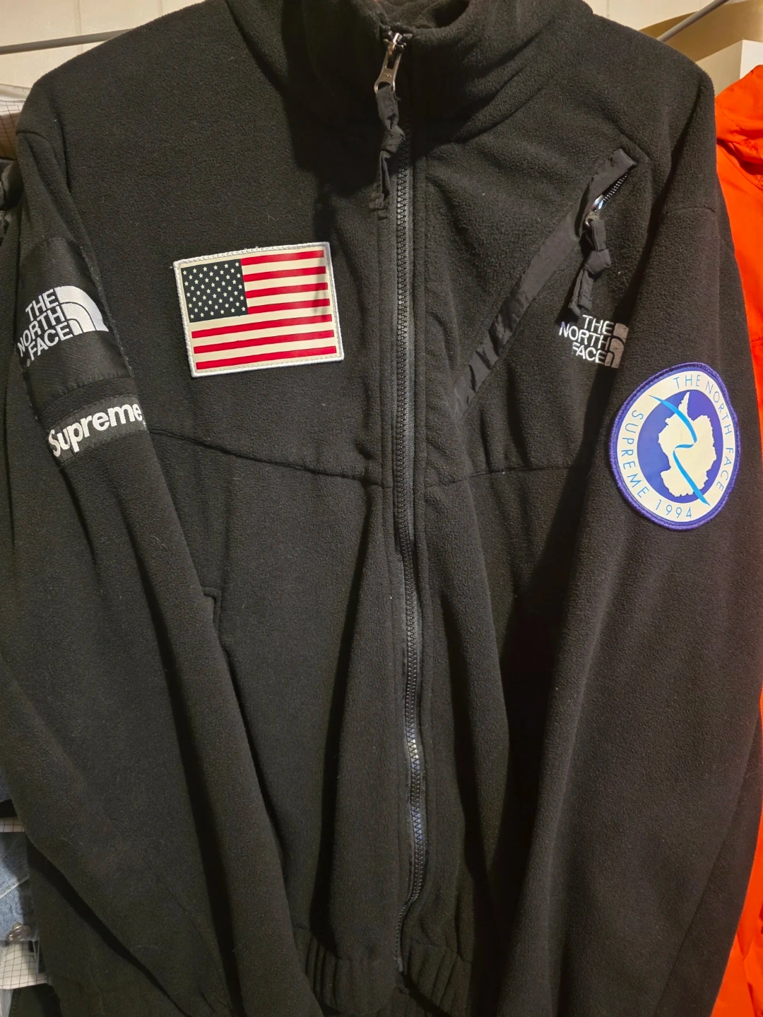 Black fleece jacket with US flag patches on front and back. Features "Supreme" branding on the sleeve and collar. Size L. Perfect for cooler weather!