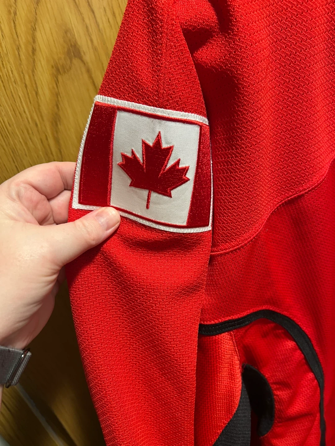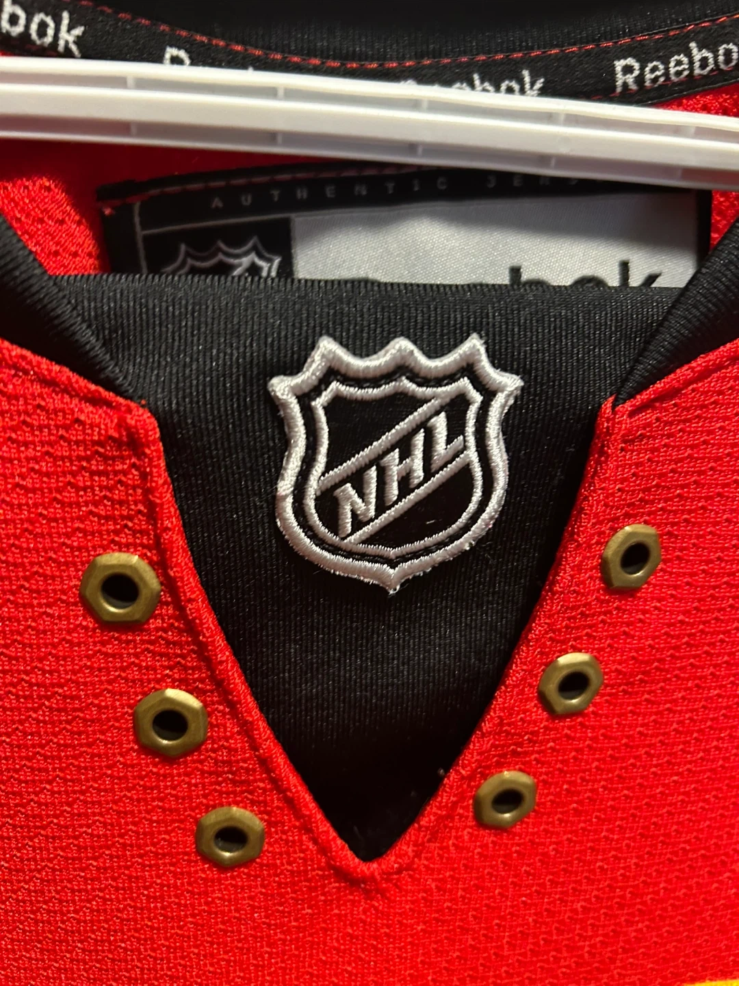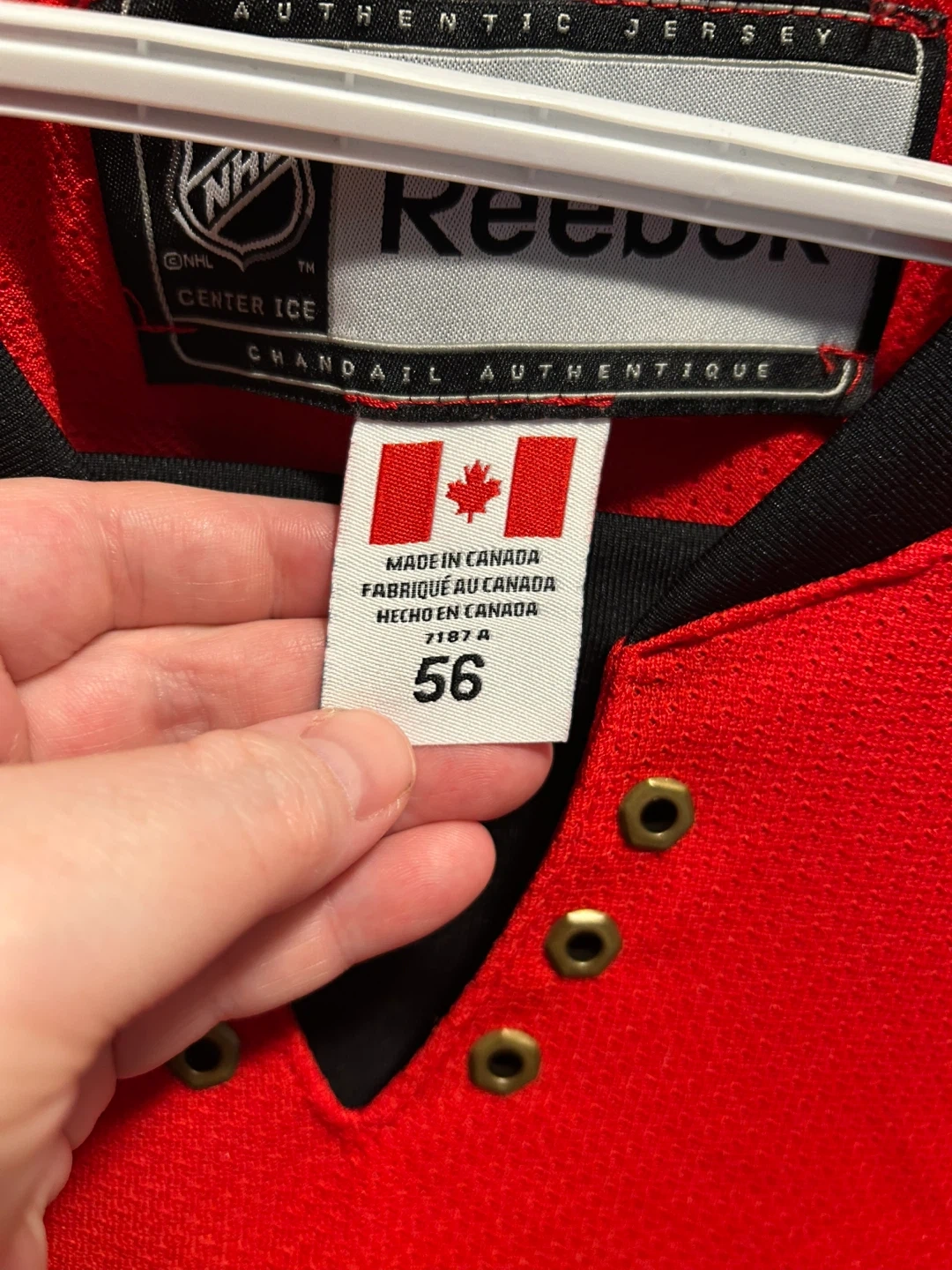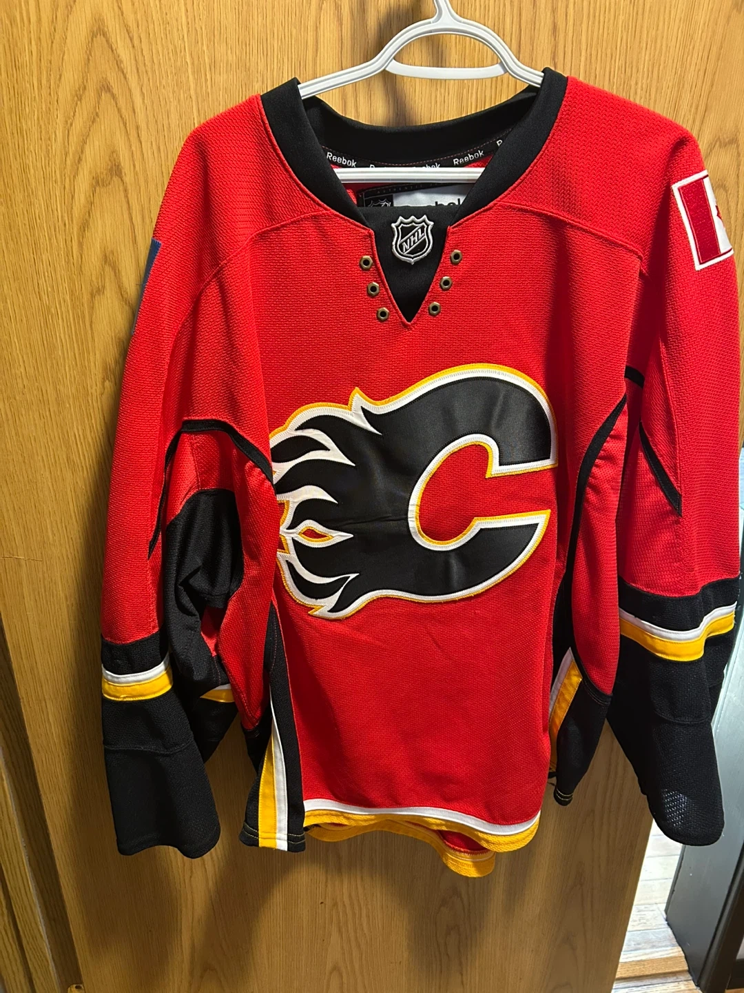 Calgary Flames authentic hockey jersey by Reebok. Made in Canada. Size is 56. Missing the front lace around the neck.