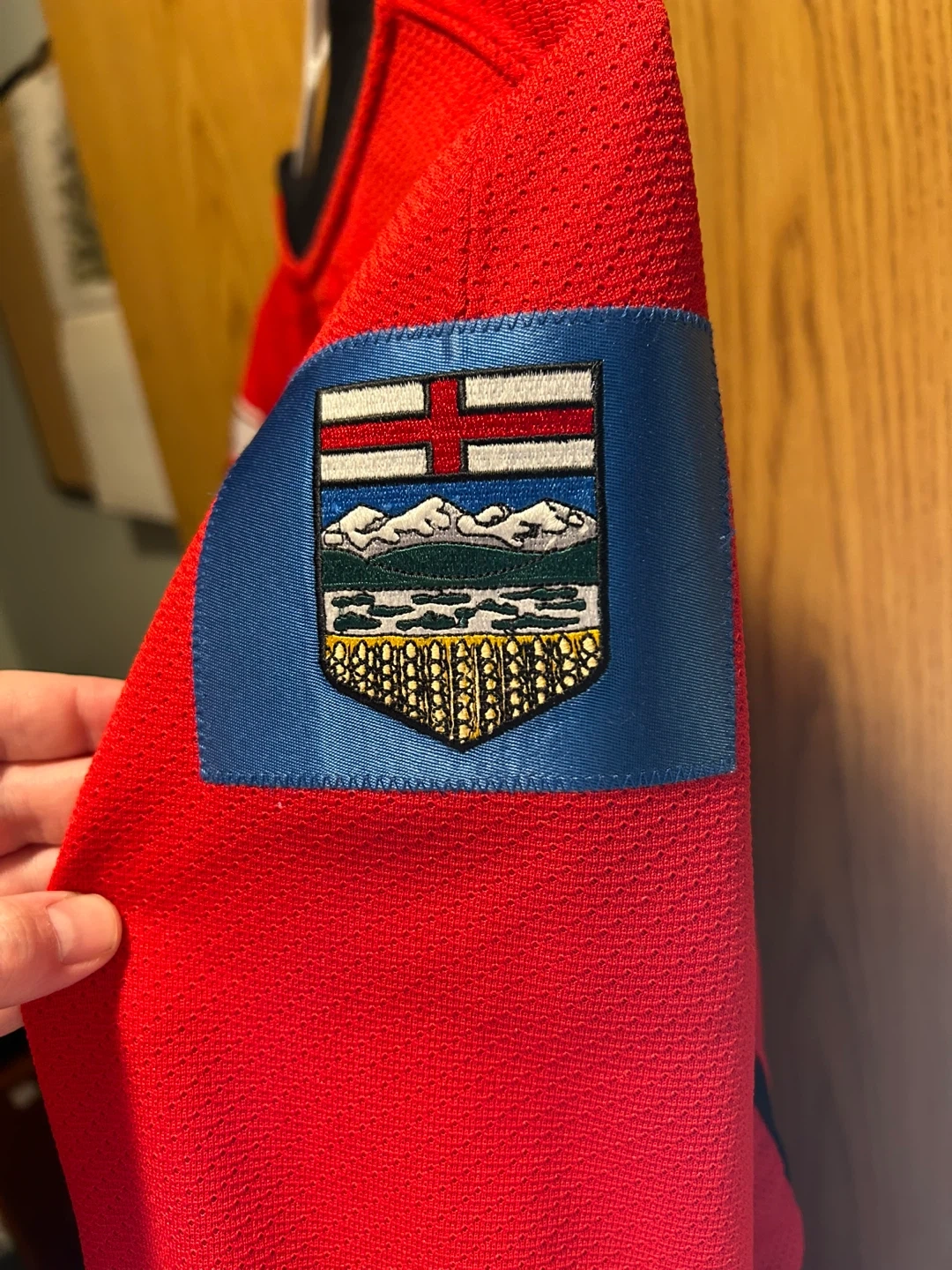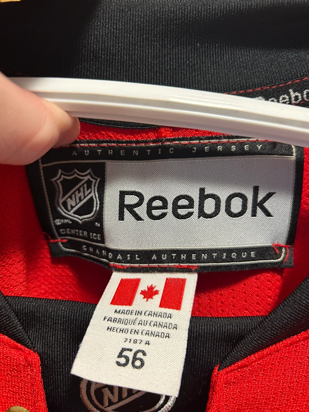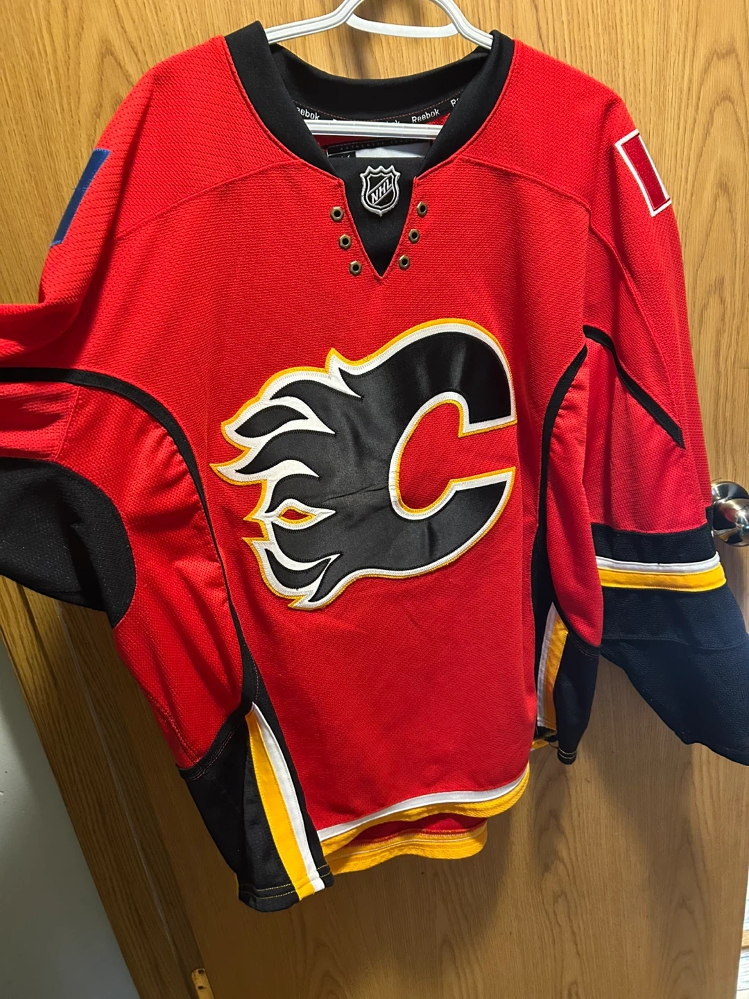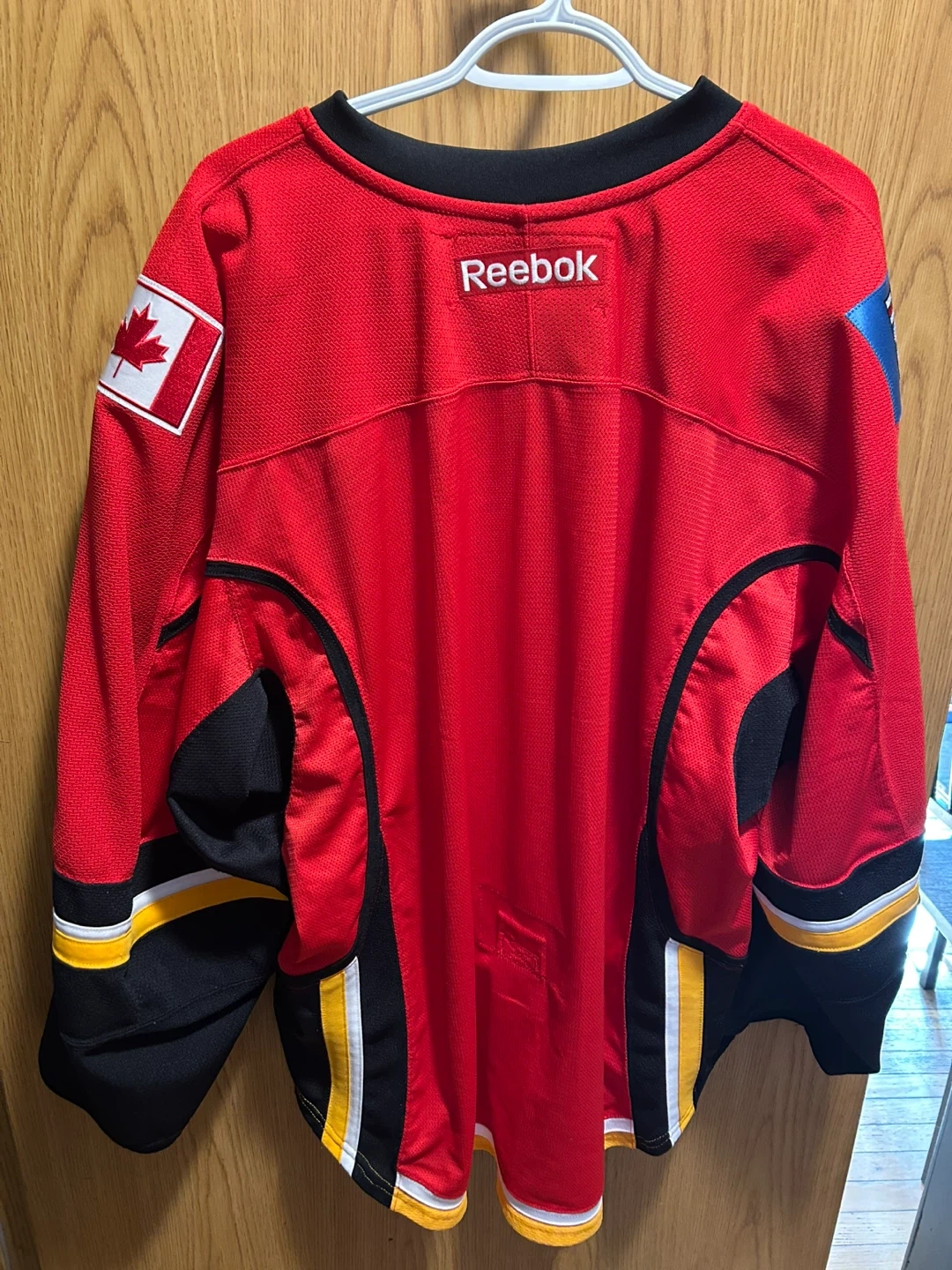 Calgary Flames authentic hockey jersey by Reebok. Made in Canada. Size is 56. Missing the front lace around the neck.