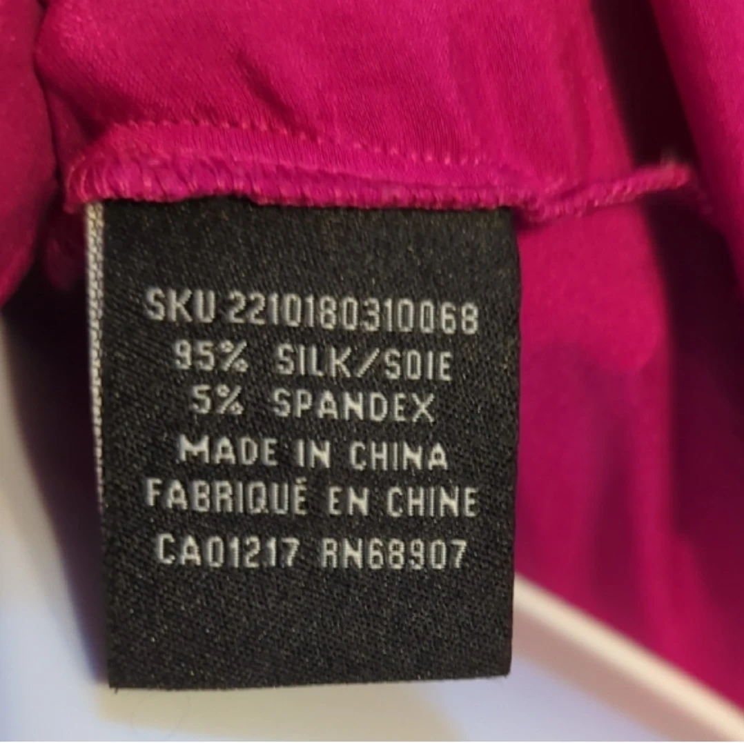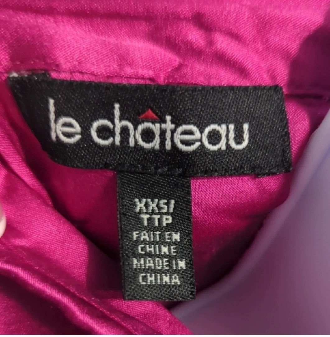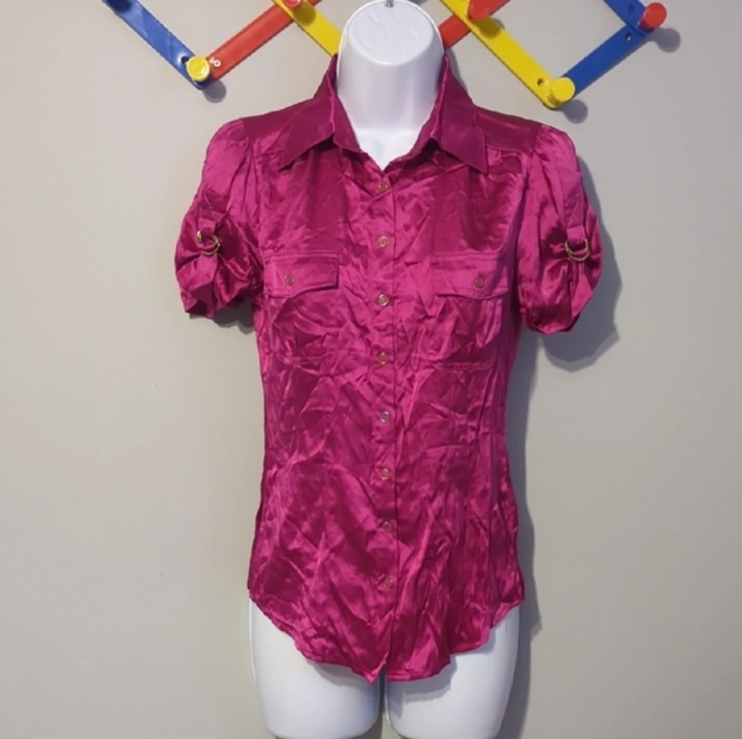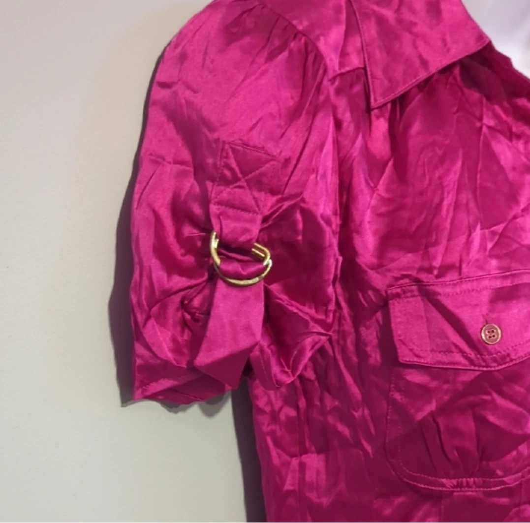 This Le Château short-sleeved blouse is a vibrant pink colour. It's made from a silk and spandex blend for a comfortable fit. The shirt features two chest pockets and gold-tone ring details on the sleeves.