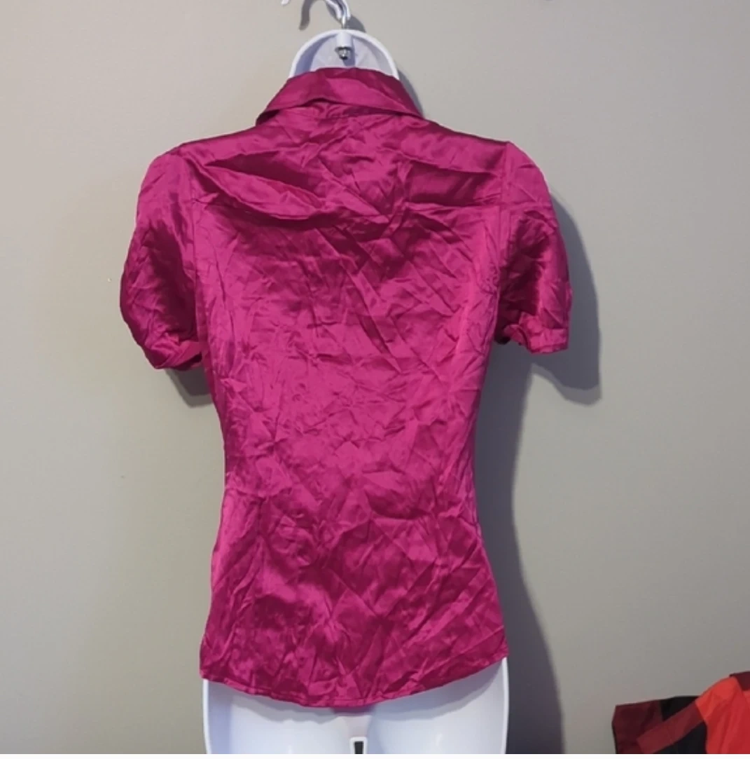 This Le Château short-sleeved blouse is a vibrant pink colour. It's made from a silk and spandex blend for a comfortable fit. The shirt features two chest pockets and gold-tone ring details on the sleeves.