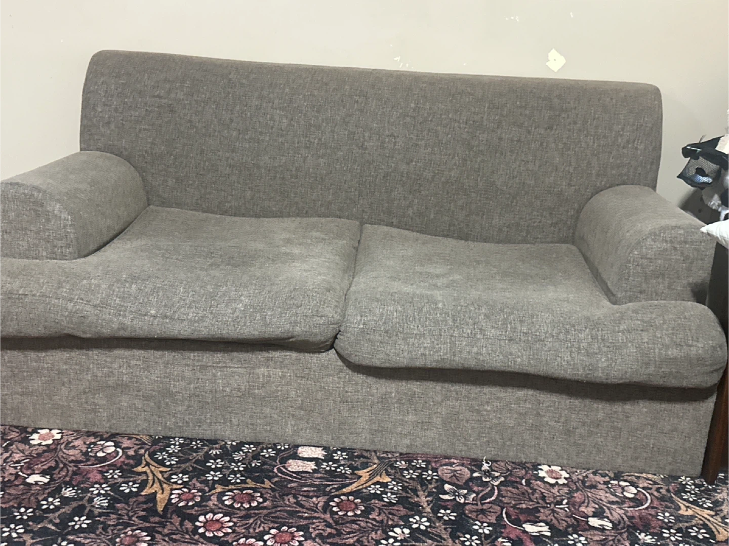 Comfortable two-seater sofa in a neutral grey fabric. It's upholstered and features two seat cushions. This sofa would be a great addition to a small apartment or a den.