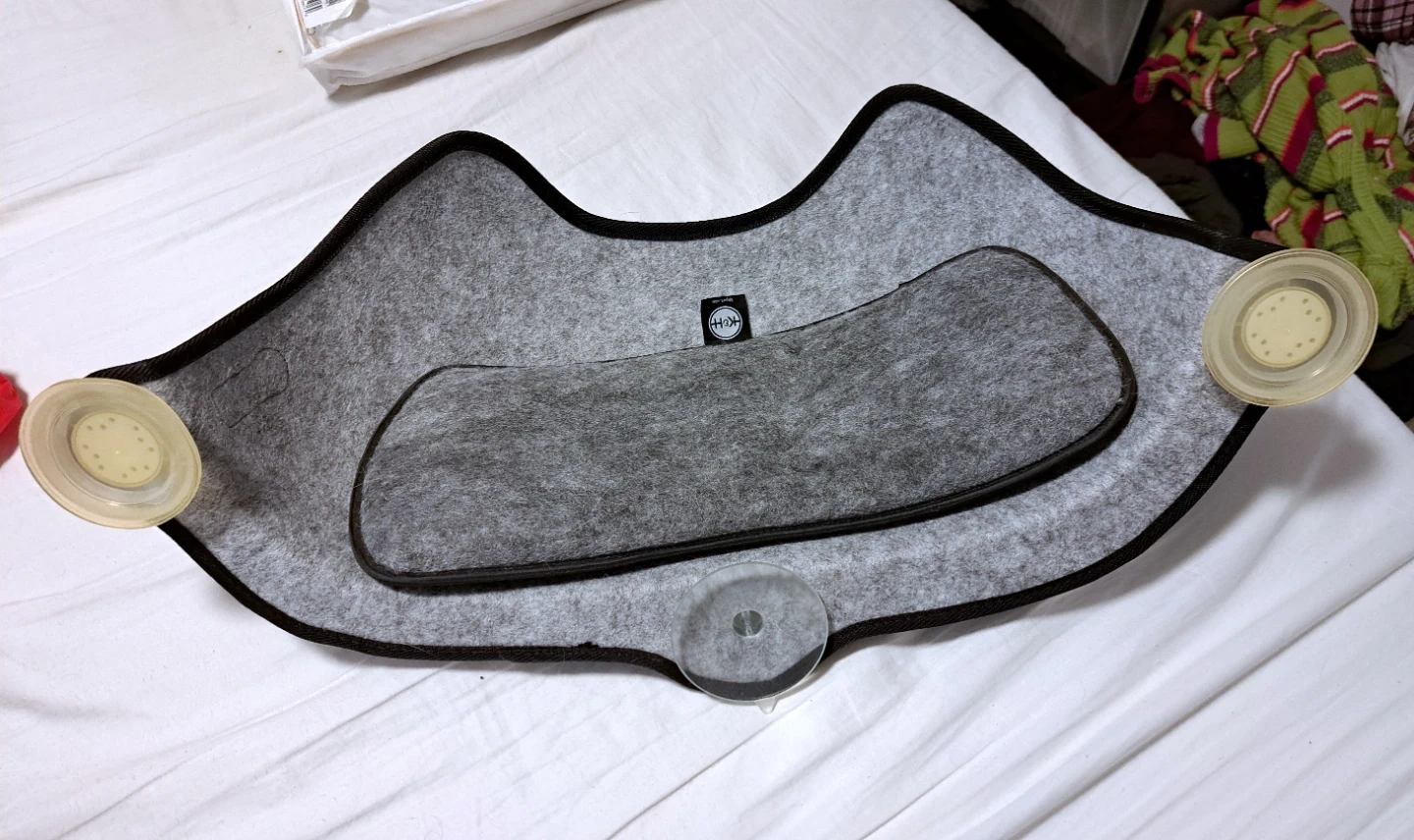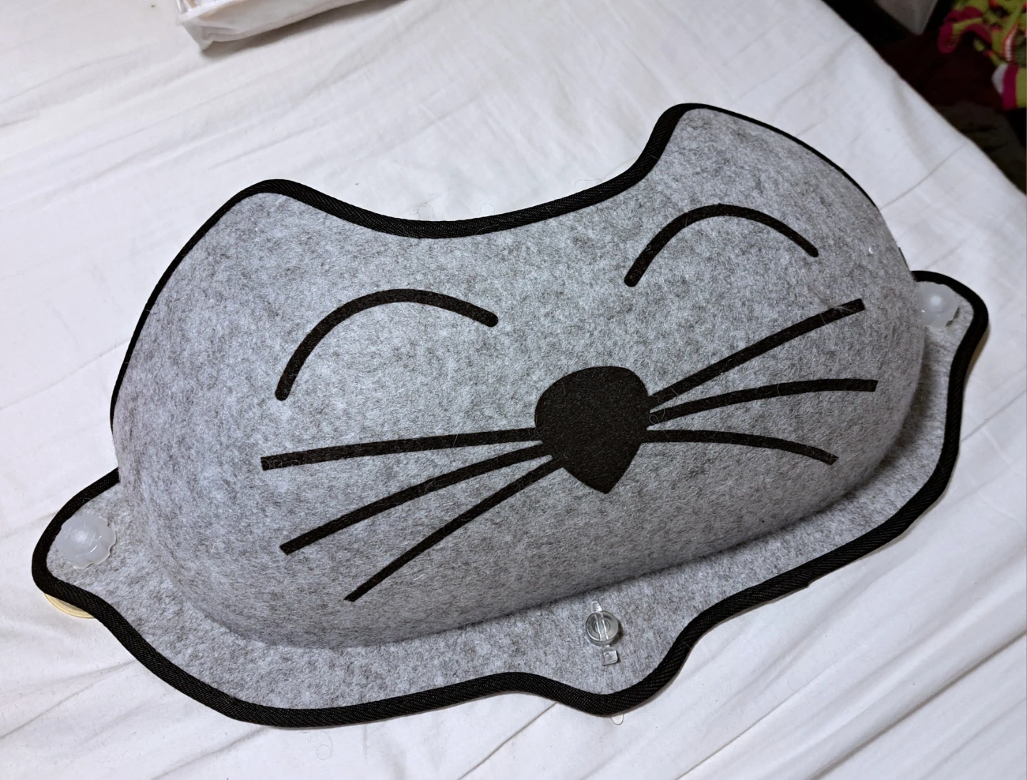 Felt pet hammock with a cute grey cat design and black trim. It attaches to windows using suction cups. Features a soft felt pad inside for comfort. Perfect for small cats or kittens to lounge in!
