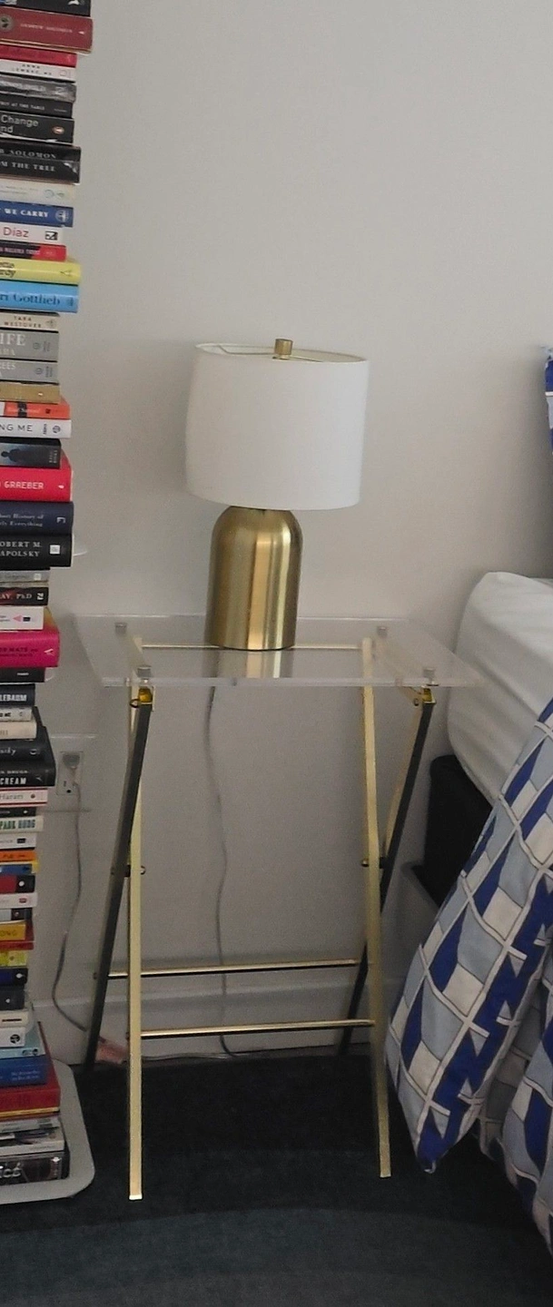 Selling a sleek CB2 Novo Acrylic Folding Table. A stylish, modern accent piece that easily folds and tucks away when not in use. It’s clear acrylic with brass finish legs, so it blends in beautifully with a range of decor styles. Gently used, very very minor surface scratches (expected for acrylic), nothing deep. No structural issues, folds cleanly, legs are stable, and from a smoke-free and pet-free home.