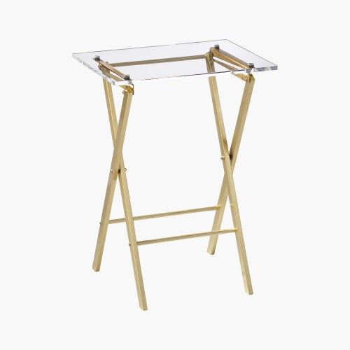 Selling a sleek CB2 Novo Acrylic Folding Table. A stylish, modern accent piece that easily folds and tucks away when not in use. It’s clear acrylic with brass finish legs, so it blends in beautifully with a range of decor styles. Gently used, very very minor surface scratches (expected for acrylic), nothing deep. No structural issues, folds cleanly, legs are stable, and from a smoke-free and pet-free home.